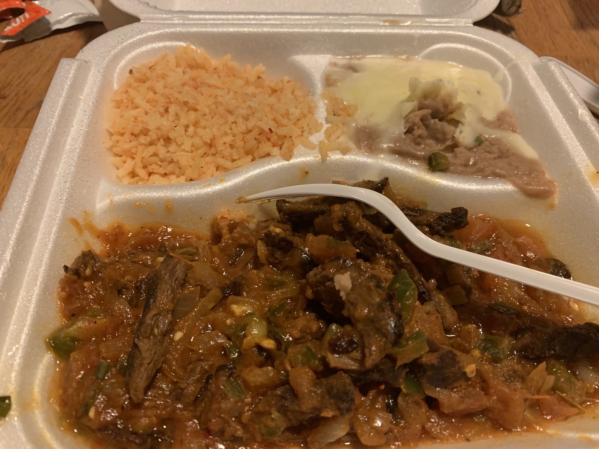 They have a large clear divider between the customers and the cashiers/cooks. On the divider for lines, the left side says place order here and then the right side says pick up here, but I guess it doesn't really matter? People were standing everywhere. Since my order was for pick-up I waited on the right side, but that didn't really matter. After waiting about 5 minutes, I was able to tell them I was there for pickup and my food was ready. The to-go bag did have salsa, but no napkins. The food is not authentic, again this is just based on my personal experience and opinion. The steak for the taco was very dry and had no flavor. The nachos had ground beef instead of steak. I also put on the order no beans, but there was beans.