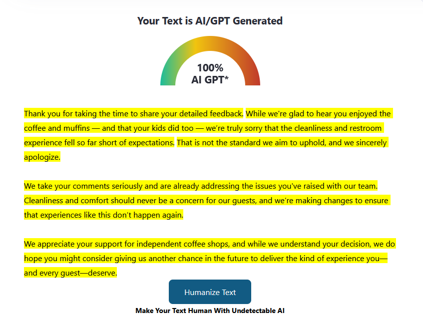 Although the owner has "personally" reached out to me to express their concerns with their business, I cannot help but wonder why I did not receive the common courtesy of an actual response from a human, rather than an AI generated generic response (I included the screenshot of the software below).