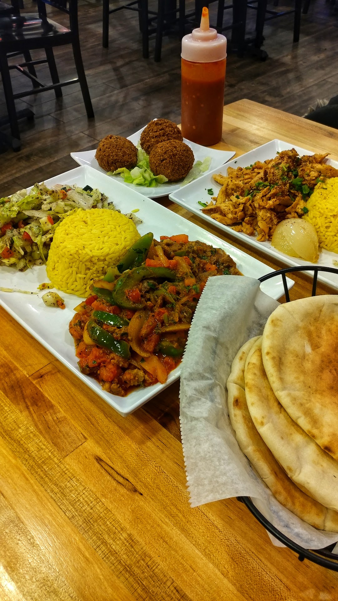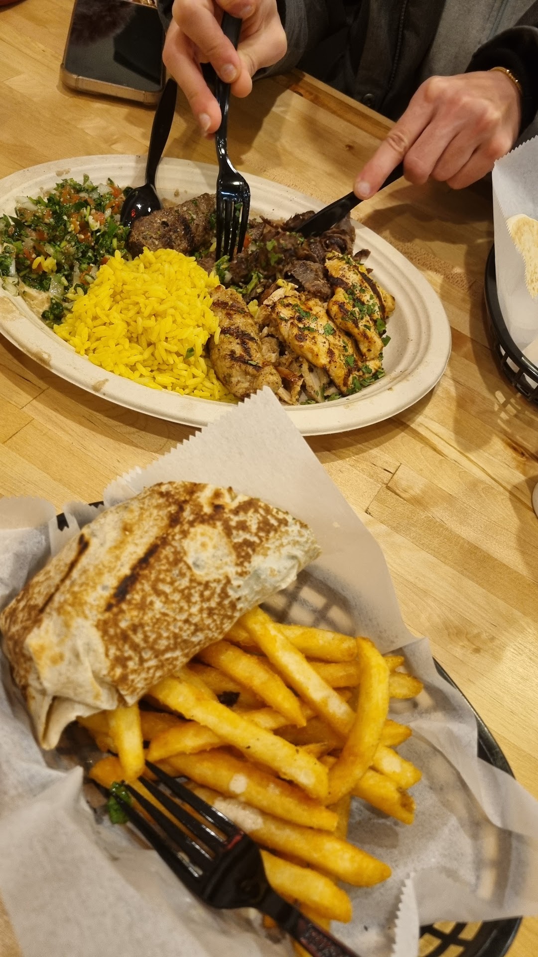 We ordered the mixed meat platter with rice and tabbouli , and taouk wrap with fries and fountain drink. The presentation was great. Taouk wrap was very good compared to most of the sandwiches I try in the West,(only advice from a Lebanese is to ditch the tomato and lettuce and add fries and more garlic sauce in the sandwich to make it more authentically Mediterranean). The chicken kebab and meat kebab were the highlights in the mixed meat platter. I'm not a big fan of the beef shawarma- it could be more tender, chicken shawarma also needs to be more juicy. Tabbouleh was good but needs more lemon to perfect the taste and rice was ok. All comments are to make Pita Pita even better.