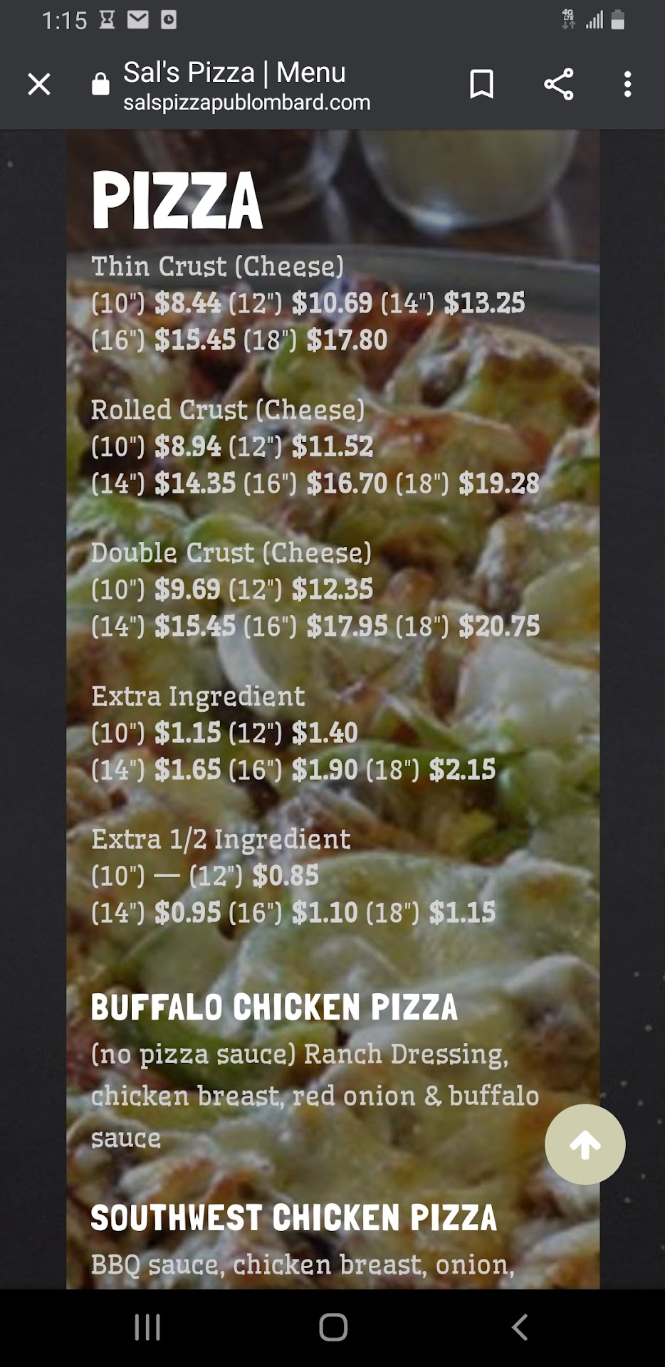 Read moreI've lived in the area for 6 years and never tried Sal's. Had a craving for pizza this eve and have been trying to support local/small businesses and ordered from Uber Eats. We ordered a cheese pizza and fried mushrooms. The pizza was good. Thin crust, very cheesy. The mushrooms however were disgusting. The bag itself smelled like what I can only describe as wet dog. When I pulled the mushrooms out they smelled the same. Why I even attempted one I didn't know, but I tried one and spit it out and dumped the order. Can't for the life of me figure out what that smell and taste actually were. Glad I ate a couple of slices before having my appetite spoiled by...