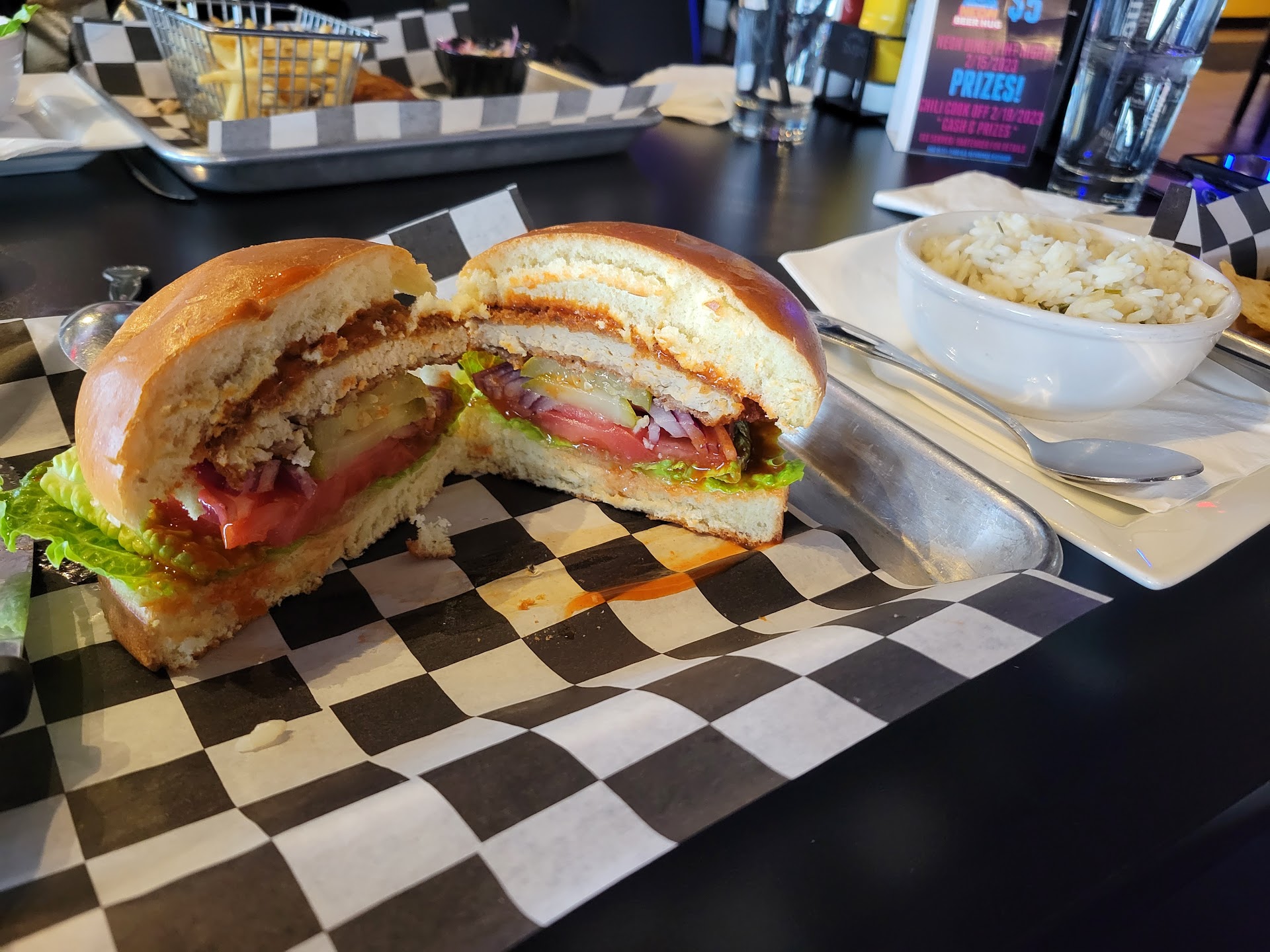 They have the same menu as the Brookfield location, and I can say that the vegan menu is very impressive. I have had many items on the vegan menu, and for this Lombard visit I had the vegan buffalo chicken-wich. It was a good sized vegan-chicken patty smothered in a spicy buffalo sauce. I quite enjoyed it. My friends shared a giant Bavarian pretzel which looked very good, and came with three different sauces.
