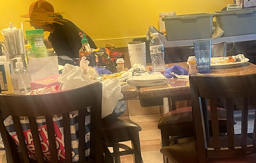 The table in front of me had used medical grade gloves on it, a bath and body works bag in the chair full of stuff, prescription bottles and other things and a dish cart was sitting out by a table.