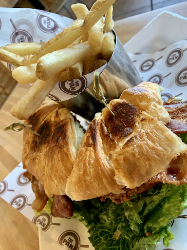 Smell the sweetness off these fluffy clouds of deliciousness — lemon-vanilla butter is soooooo addictive! Yum!!! M couldn't wait to dig into it, & was super impatient as I cut the pancake into bite-size pieces. This little guy always test my poor knife skills when he's craving something... a sad reminder that he missed their pancakes on his birthday a few years ago since he said, "I didn't get blueberry pancakes on my birthday, Mommy." :-*( My sandwich was a bit messy from all the flaky croissant's crumbs; it's a BLT with added chicken... quite tasty, especially with the cilantro jalapeño aioli! Nom, nom, nom!!