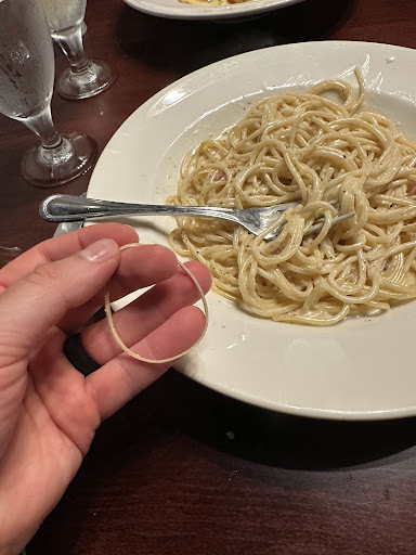 We ordered the Italian wedding soup and a Caesar salad. The soup was fine. The salad was fine except the croutons were completely stale. My wife got the lobster ravioli and she enjoyed it. I ordered the spaghetti carbonara. The food came out hot which I appreciated. However as I was eating I bit into something extremely chewy. It was a rubber band. At that point I stopped eating and asked for the check. After I paid I informed the waitress that I found a rubber band in my food. To her credit she stopped me and had the owner void the bill which I do appreciate.