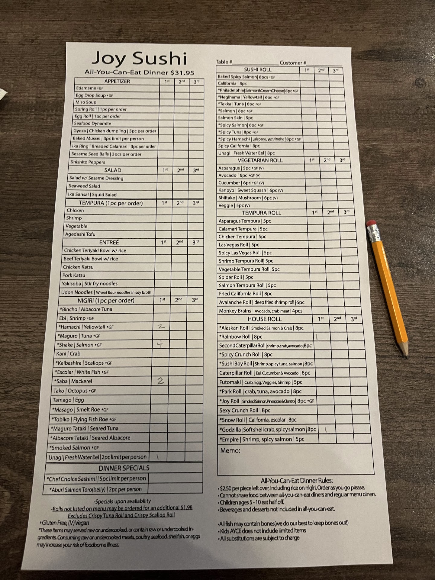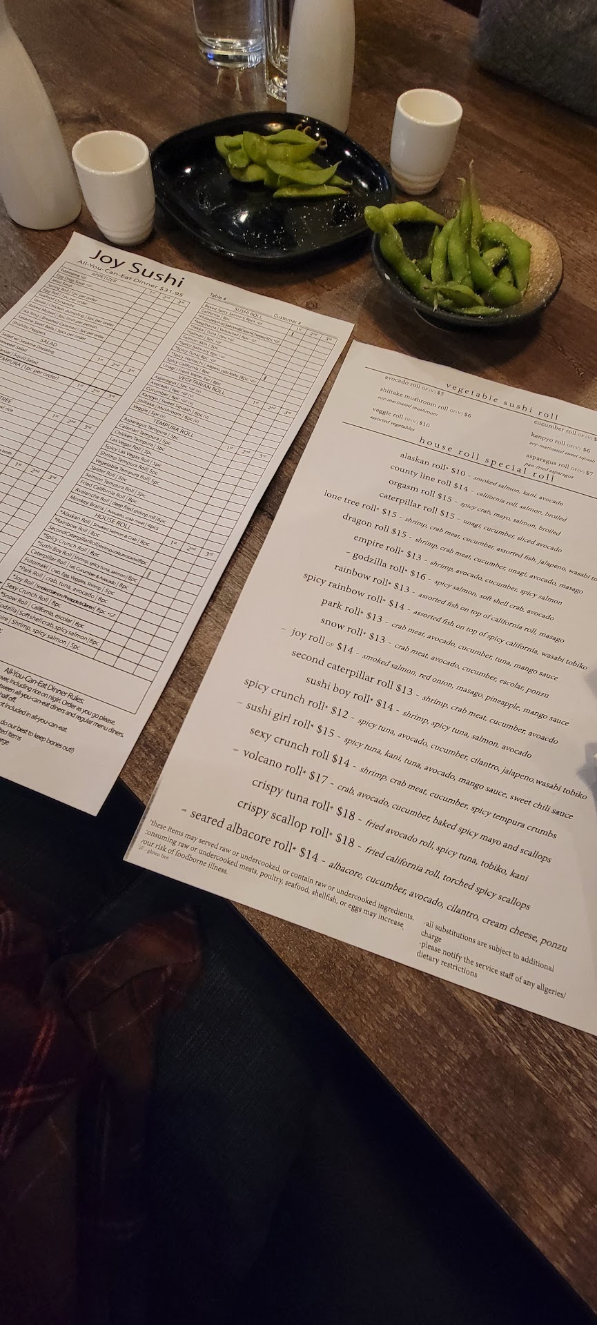 So much for enjoying a good meal, you are kicked out on the curb. They did have 2 of 5 rolls that were tasty, but you must swallowed them all, or receive the penalty if this experience. I say; avoid the JOY Sushi because they have nothing...