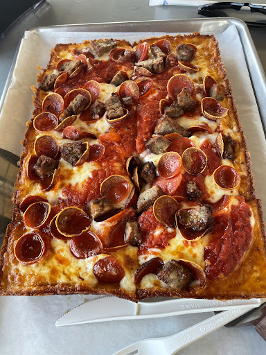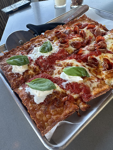 Read moreDisclaimer: Never had Detroit-Style pizza previously so I don't have anything to compare it to. Not your typical pizzeria. Small, low-key spot that can easily be missed if you aren't looking for it. Has a coffee shop vibe to it. The pizzas are laid out on the display case in front with plenty of options to choose from. A board on the back wall also lists out all the options. If you order by the slice, they are warmed up in what looks like a small toaster oven and then served. I didn't get creative although I wish I had because the BBQ chicken and Buffalo Chicken looked and sounded good respectively. I stuck with the 4 Cheese plain slice, Pepperoni w/ Hot Honey slice, and a Side Cheesy Garlic Bread. The bread on all of them was fluffy and enjoyable. My favorite was definitely the cheesy bread and pepperoni w/ honey was a close second. The cheese on the plain was too sharp for my liking. It was not the best pizza I have had but I enjoyed it enough and there were plenty of options that caught my attention that I would pay another visit if I was...
