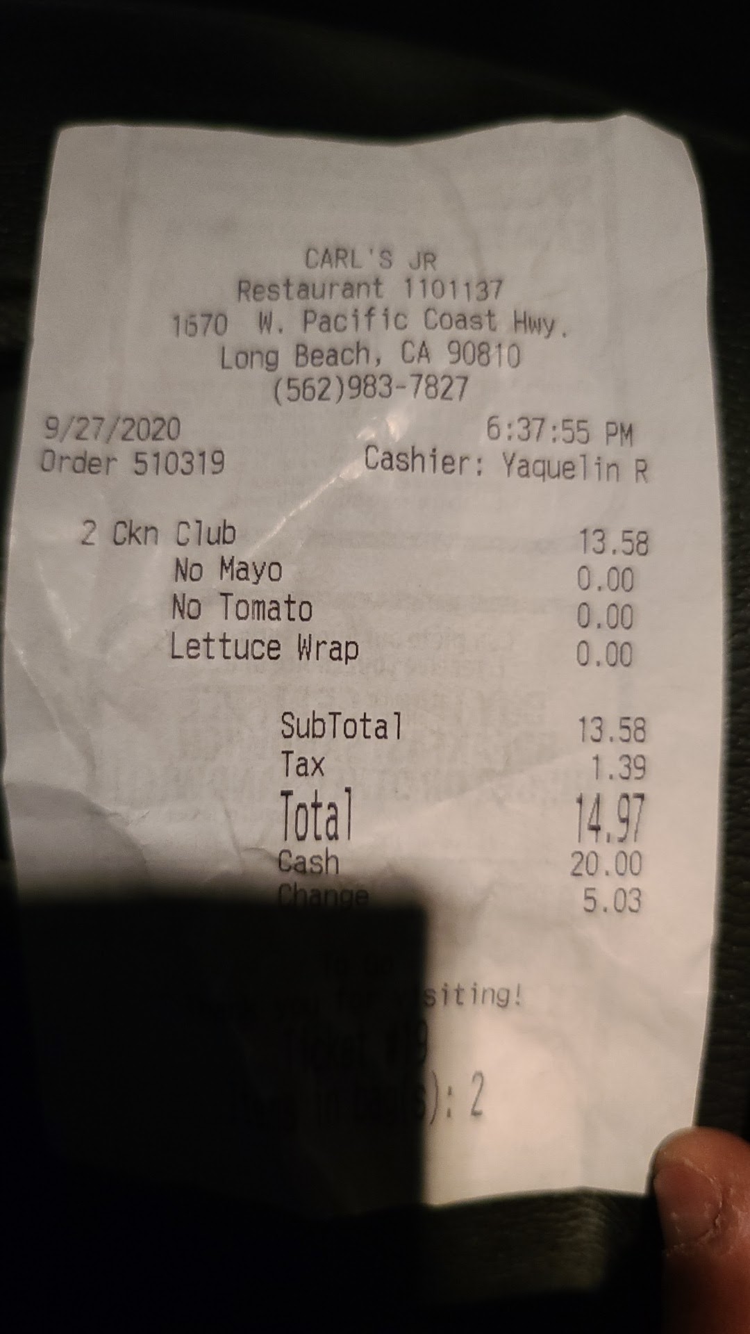 This Carl's Jr. is way in the back inside the Shell Truck Stop on Pacific Coast Highway. The truck stop convenience store fills up most of the building and it's clear from the attitude of the staff and the truckers restlessly shifting in place as they wait to be rung up that this is no place to linger. Everyone is in a hurry to get those rigs back on the road. It's different in the back. At Carl's Jr. because you know you'll have to wait at least as long as it takes to cook your order, the pace is more relaxed and I've frequently noticed a Carl's staff person spending a few moments in friendly conversation with one of the regular truckers having a meal. It's a sign of the times that I get a warm glow thinking about those brief moments of fast food chit chat as if they were the apotheosis of the human need to establish meaningful relationships with each other. But I do remember them with nostalgia because that casual, relaxed feeling is gone. In its place is the cold, cordoned off areas to stand, to order, to wait, to get one's order and then to leave. No one can use the booths anymore. The truck stop is noisy and the new lucite barriers between Carl's staff and the customers means ordering now means raising one's while still keeping the mask in place. Everything feels awkward and stilted. Despite all this, the food is still the best Carl's Jr food I've tasted in Southern California. The staff seems almost eager to personalize your order by making special requests a snap and then double checking your order just before handing it to you. All that still happens. It's always clean. What more can I say? It's all those good things but it's still a sad and stressful...