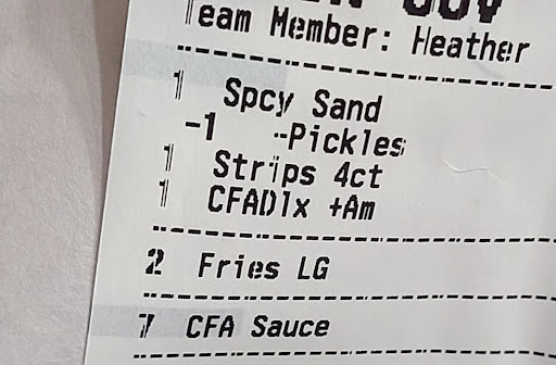 My husband, daughter & I were visiting family in Long Beach. They were coming back from swimming and soccer practice. So we needed to feed 4 hungry growing kids ages 8 to 14 and 5 adults. Chick-fil-A seemed an obvious choice for picky eaters. My daughter downloaded the Chick-fil-A app, took down the extensive list of the classic chicken sandwich with & without pickles, chicken nuggets, a plain classic chicken just meat and bread. The spicy chicken sandwich, two wraps, a market salad and a ton of waffle fries.