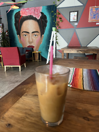 The ambience is warm and inviting, making it a perfect spot to relax. The baristas are friendly and helpful, often assisting customers in choosing drinks. The cozy decor consists various couches, a communal bench, and bookshelves stacked with books, complemented by plenty of natural lighting A standout piece is a beautiful painting of Frida Kahlo done by a local artist, adding a unique vibe to the atmosphere.
