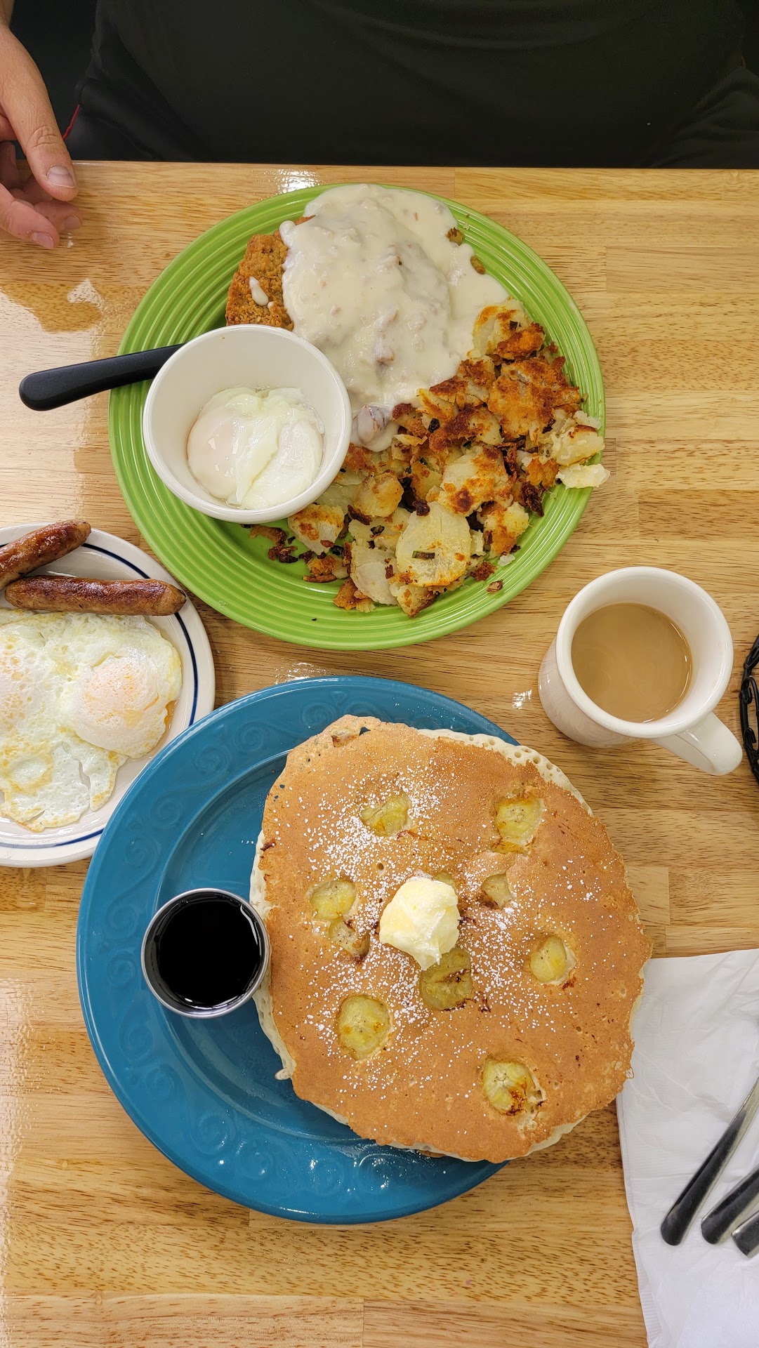 Oh man, what a find! We came on a week day around 10 and there were just a few other folks dining in or waiting for take-out. I got the Banana pancakes combo with sausage and eggs. The latter two were as expected but the banana pancakes were amazeballs- not to mention, much larger than I thought they would be! My hubs got the country fried steak (of which they only have a limited supply, so come early), soft poached eggs, homestyle potatoes, and the biscuit and gravy, all of which were phenomenal!