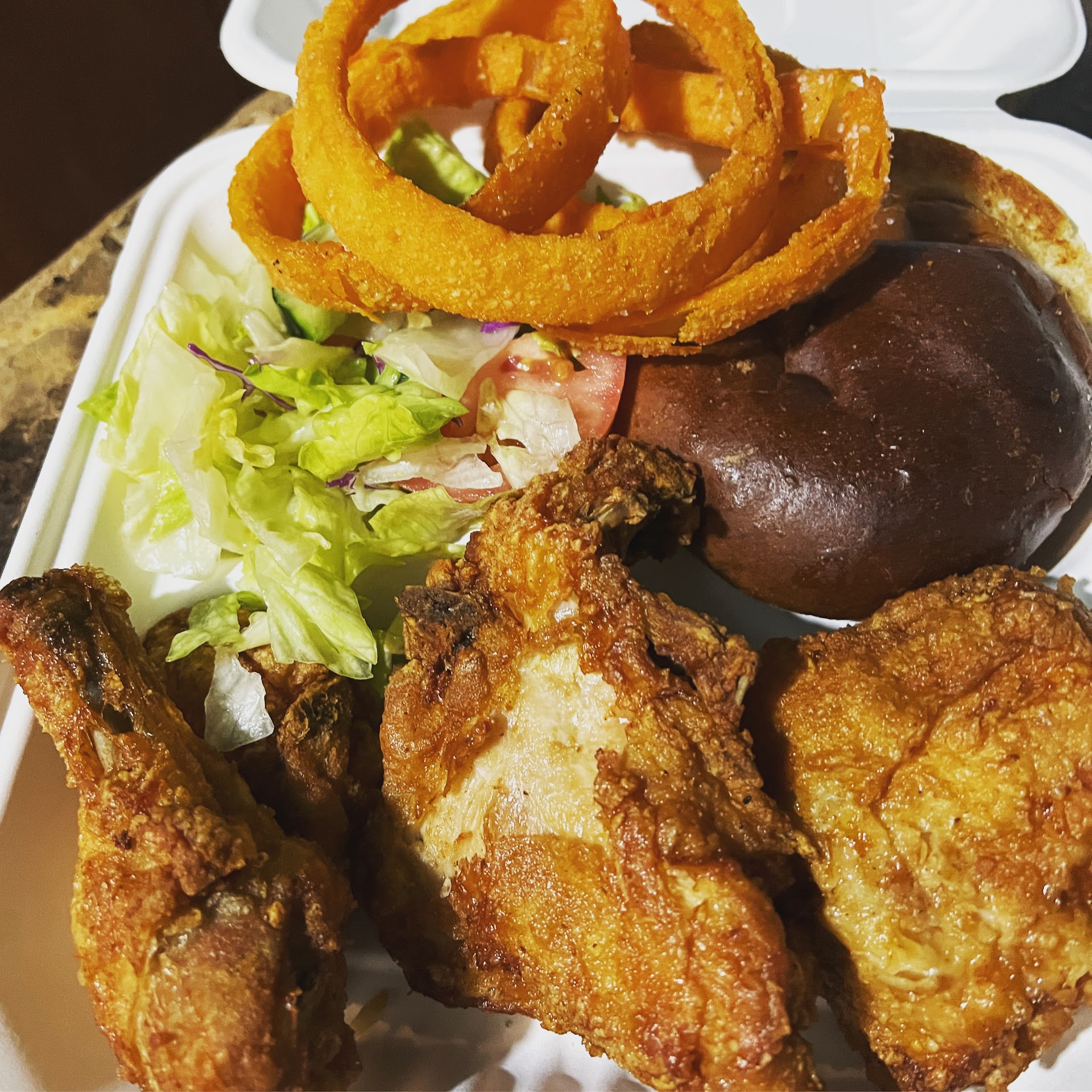 The chicken was well made, tender and juicy but the batter was off. It tasted like oil. I was expecting actual dinner rolls but got toasty & buttery buns. I substituted onion rings over french fries. And yes they do charge extra. Onion rings were good except once again, the batter was off. Ranch is extra.