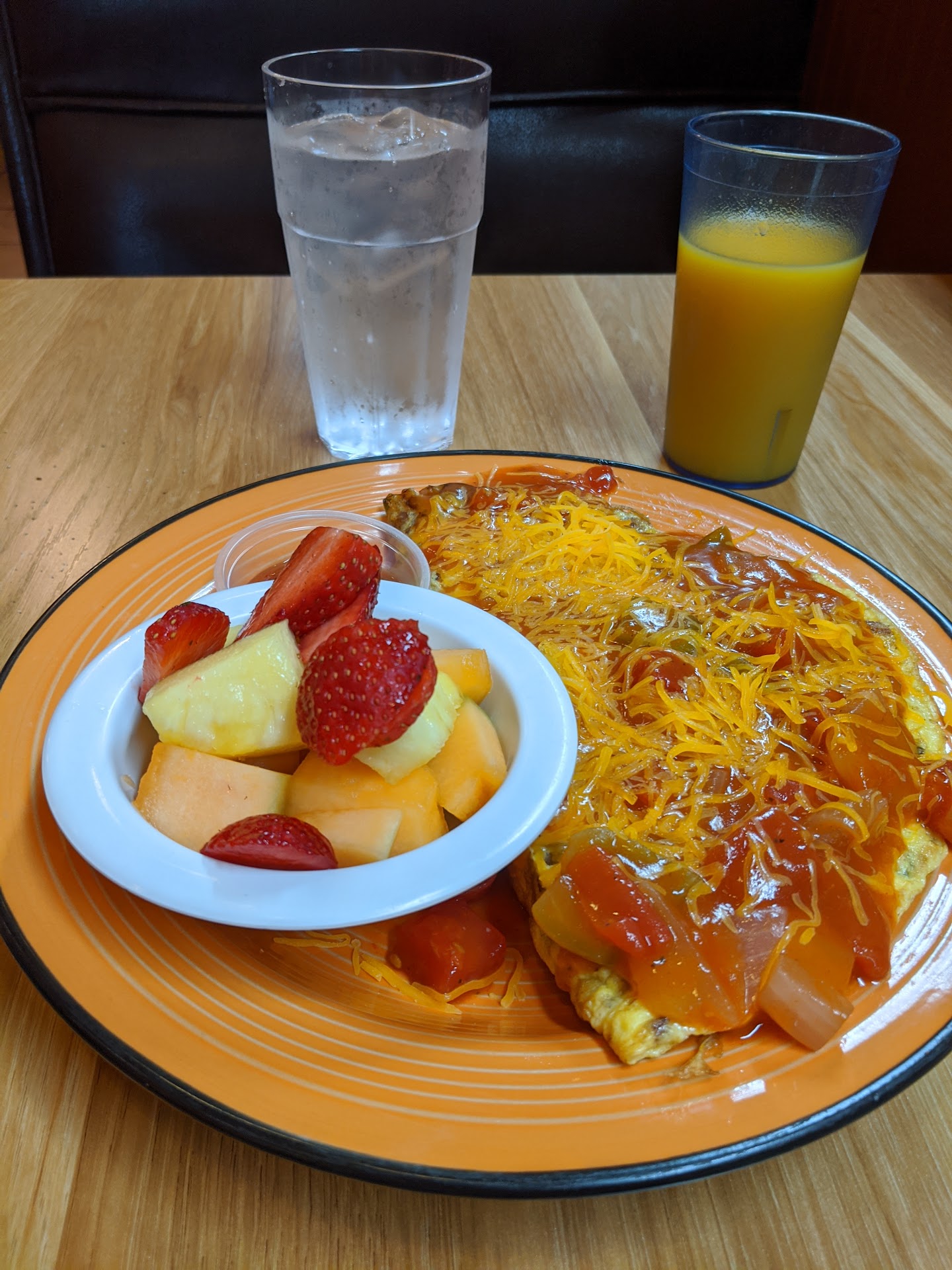 I came at the end of Sunday rush. The waitress just wanted to get out of here and was very uninviting. The place was a disaster, the floors were disgusting with food and trash everywhere and we had to clean off our seats before sitting down. But the table was supposedly cleaned with new silverware already placed. The bathrooms were also very dirty.