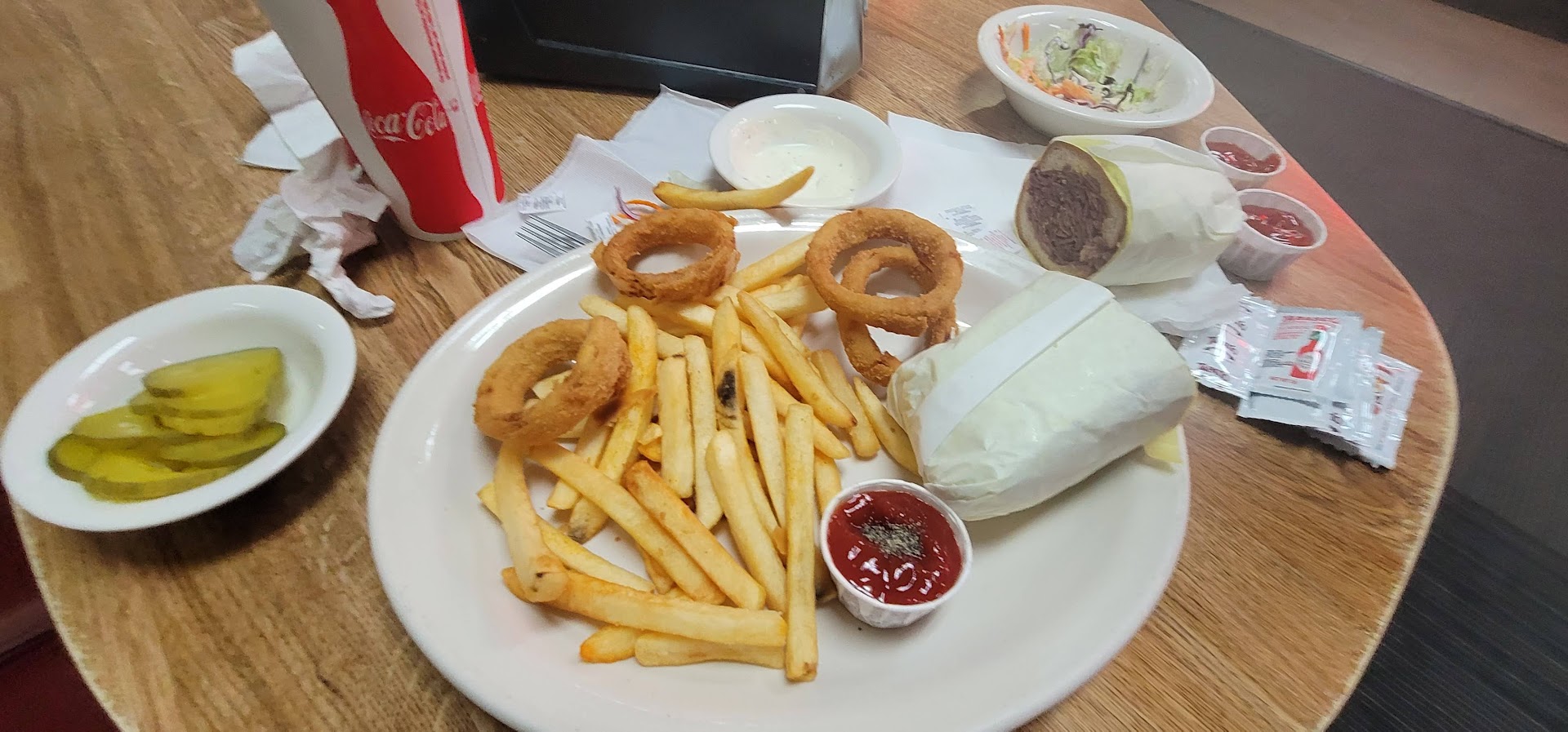 Read moreWe stopped to eat in the evening time the cashier at the counter was very rude he wasn’t friendly at all he just had an attitude. None of the other employees greeted us with a hello thank you or anything else. We had the pastrami sandwich chili cheese fries and zucchini. The chili cheese fries were good the pastrami was doing great until we found a foreign food item that didn’t belong and it just ruined things. The zucchini literally tasted like freezer burn but because the guy was so rude we were intimidated to go up and complain about our food also we spent $30 on our food and that wasn’t including a drink you would think that there would be a clean table for us to sit at each table was cleared but it wasn’t wiped down. We were completely...
