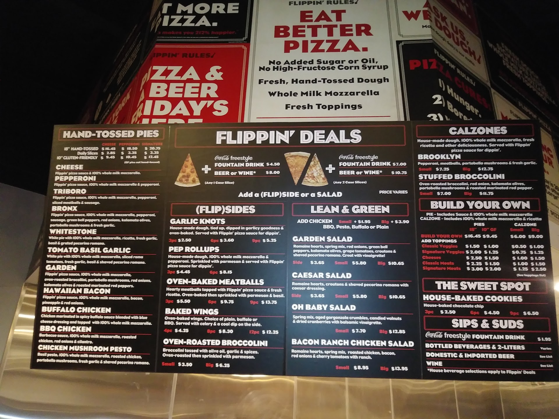 Read moreI was overall unimpressed with Flippin' Pizza. It started off well, I found the place on Yelp and saw the good reviews. I was excited. When I entered, the place had a good atmosphere to it and the cashier was friendly and helped me get used to the menu. I ended up ordering a house salad, a slice of the buffalo chicken, and a slice of the Brooklyn. Around $12 total. As soon as I saw what they brought out I knew this wasn't going to be what I thought it was going to be. The toppings on the pizza slices looked sad and sparse. Tiny little pepperonis, a few chunks of chicken, and large vacant areas of just cheese. Kind of reminded me of a balding man's head when he only has a little hair left and is trying to use what he has to cover the empty space. The flavor of the pizza was good though and I enjoyed eating it. The salad had half good green lettuce and half yellow/white harder pieces. Since it was over $5 I was really expecting a better quality salad.