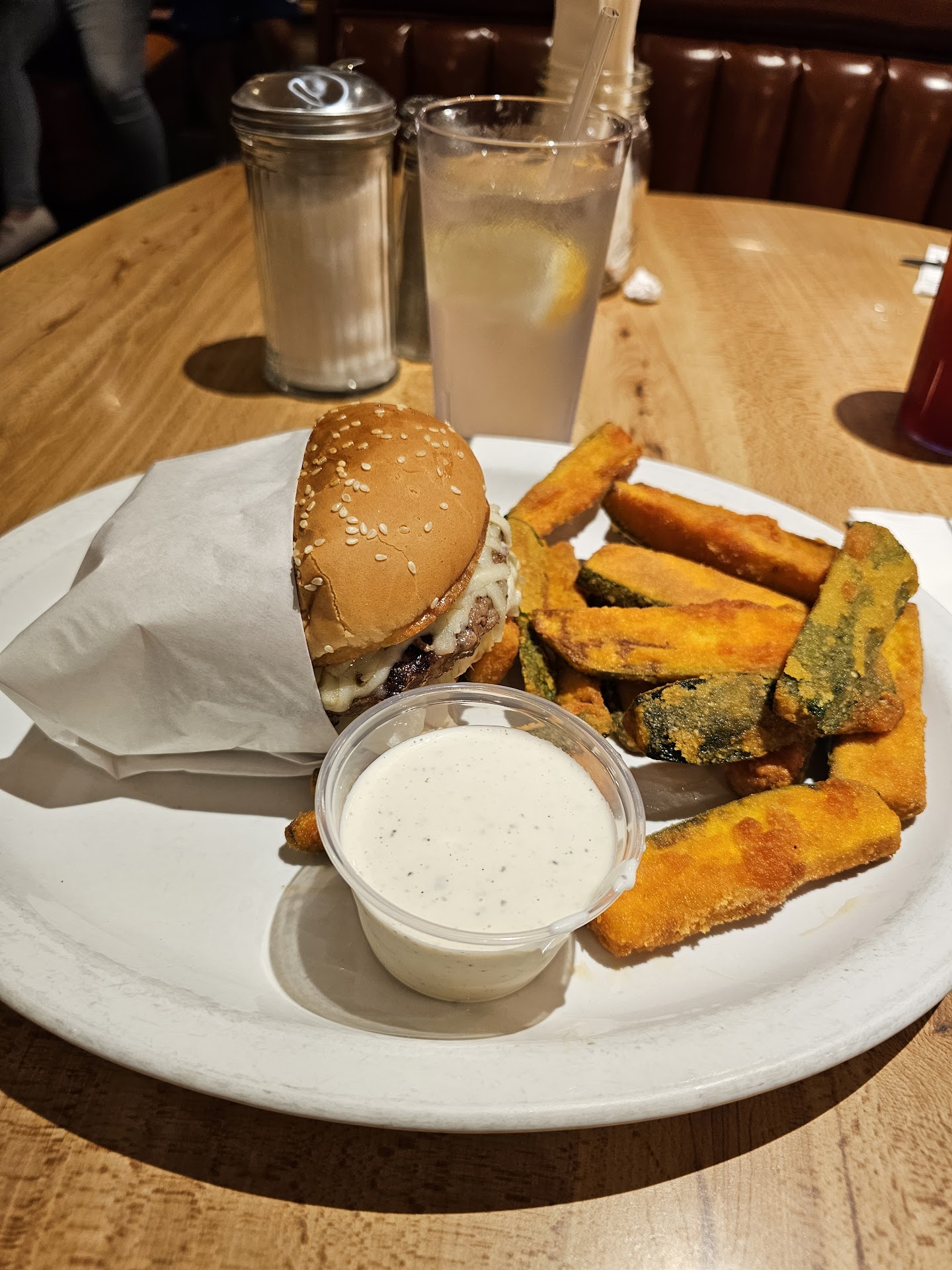 Our 1st time on a Thursday around 6pm. There were like two other parties of two eating there. We were greeted and seated down right away. The place is celebrating 60 years, it's family owned. The seats go around most of the table and are hard and old. They could really use some work. Nevertheless, we were excited to check out this place. The host was nice and brought menus. He took our drink order and came back shortly to take our order. The wifey and I both ordered burgers. She went with the avocado burger and onion rings, I went with 1/3 LB cheeseburger with fried zucchini. The food took a bit, and when it came out, we jumped right in. Everything looked great and big in size. The zucchini was great with ranch dressing. The onion rings along with the burgers were lacking flavor. We both found ourselves adding black pepper and a little bit of salt to bring out the flavor. I think the meat patty and the breading used on onion rings could use some seasoning. The servers came around a few times to check on us. We thought that was nice. The food could definitely use more flavor for our taste, but the place and...