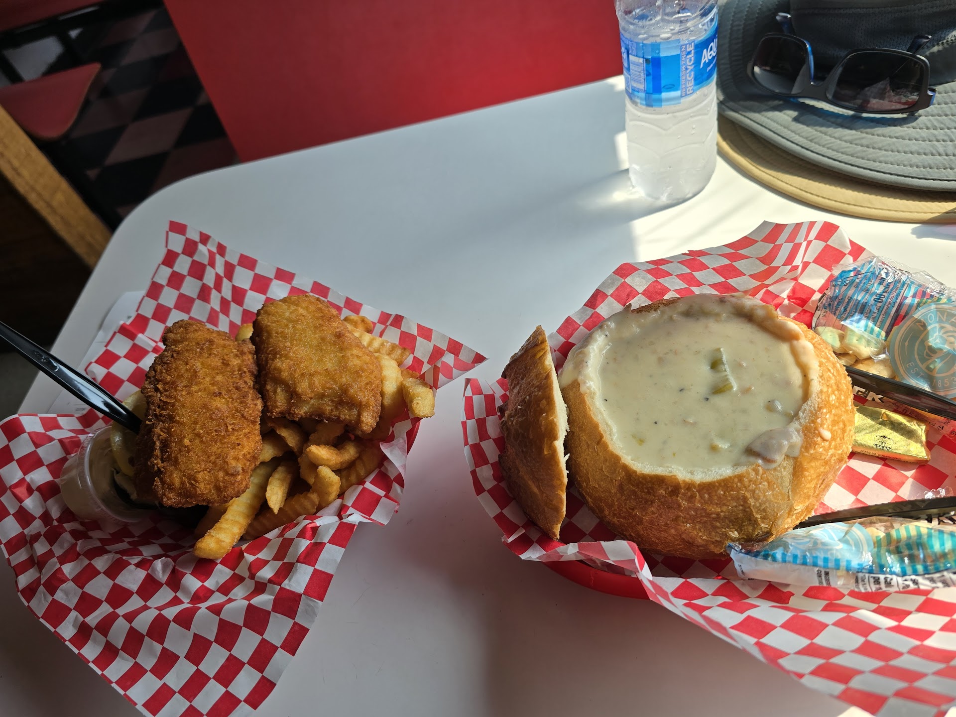 If you had asked me to rate this place any of the many times my husband and I patronized it in the past, I would have rated it 4s and 5s. We used to enjoy coming here in the off season as well as in the tourist season. However, after the way we were treated last Saturday we will never be back. My husband and I ordered the same thing. Fish and chips and the smallest cup of chowder they had. Fish and chips came 3 to a basket, on top of a bed of crinkle cut fries. Both the fish and the fries were something out of a catalogued food services order, which is fine, but should be notedâthis is not freshly caught made to order fish. Also in the basket was a small side of tartar sauce and a slightly bigger, but still very small side of coleslaw. The cup of chowder came with a dinner roll and a bag of oyster crackers.
