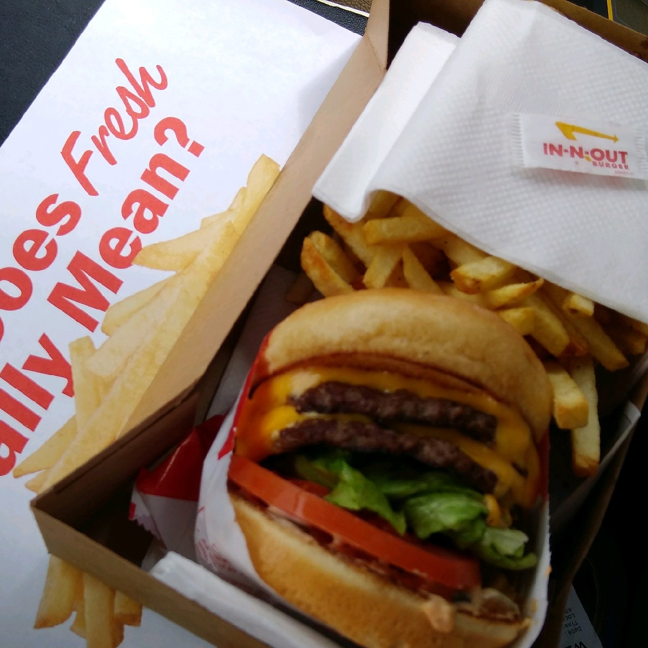 Now, let's talk about the star of the show: the Double Double burger. It was an absolute delight for my taste buds. The juicy, perfectly cooked beef patty was sandwiched between two soft, toasted buns. The combination of the fresh lettuce, ripe tomatoes, and the special IN-N-OUT sauce created a burst of flavors with every bite. The quality of the ingredients was evident, and the attention to detail in crafting this burger was remarkable. It was undoubtedly one of the most delicious burgers I have ever tasted.