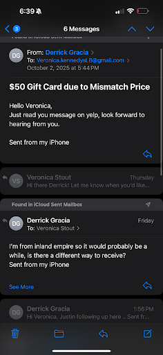 After leaving a one-star review, the owner reached out and offered a $50 gift card to “make things right.” However, when I contacted them, I was told they only offer physical gift cards and I’d have to come back in person to pick it up — despite me explaining that I don’t live nearby. So instead of an actual apology or a solution that works for the customer, I was basically told, “drive back if you want what we offered.”