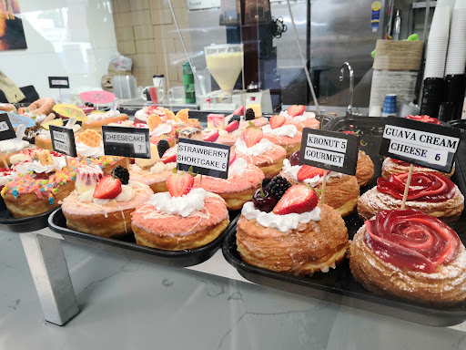 Read moreWas excited to see their logo and quickly got into their parking lot. An interesting twist : they are directly opposite in the same plaza that used to have a Winchell's Donut - it's the familiar triangular logo, now an empty shell. Very bubbly lady behind the counter, reminded me of their specials for four or six donuts. Got six of course. I was surprised that no one else was in line when I arrived, granted it was close to 1pm. The other Cerritos location always seems busy and has well stocked varieties. Got the cronut versions of guava cheese and ube Oreo, and regular ube roll donut, plus two crème brûlée custard filled ones. The crème brûlée donut has a hard sugar glaze on it and the filling is added just at purchase so it stayed pretty solid, not soggy. Got the Vietnamese coffee, it was rung up as Zombie - less sweet version and equally delicious. Smaller shop, no tables or seats but you can always eat your donut in your car. Numerous signs stating no parking for nearby businesses, but there was ample parking. Best flavor combinations were the guava cheese and ube with crushed Oreo cookies. I think the other donuts available were whimsical and fun to look at : fruity pebbles cereal, tiramisu , something looking like unicorns and maple bacon. Also donut holes. They carry croissants and a hot dog roll called Fluffy. Pretty to look at and pricey , so it's a treat , not...