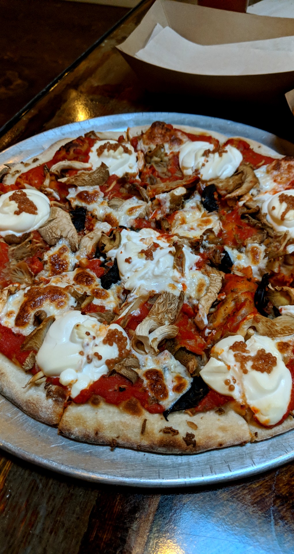 Together our order included a wide selection of their beer and food offerings (Sours, IPAs, stouts paired with a pizza, calzones and a few sandwiches). We wanted to try everything!! After our orders he gave us our beers, a number and pointed out there's additional seats upstairs!! We picked up some board games and headed up. There was a giant communal table, great for private parties or just meeting new people. The view was great (I included a pic).