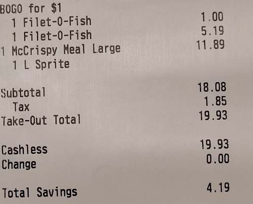 Read moreIt's McDonald's so automatically you expect to receive your order wrong. I'm not a frequent visitor of McDonald's but every time I'm driving away I tell myself "Open the bag and make sure everything you ordered is there." Lazily I give them the benefit of the doubt and don't find out that I've only received partial of what I ordered after I've gotten home, of course, right as we're about to eat. This visit was no different. Luckily enough we decided to eat our meal in the parking lot instead of driving away stuffing our faces. It was a couple of drinks, apple juices. I jump back in the drive-thru line and ask for the apple juices; without any problems they were provided. The quality of the food is very well when it comes to having the same taste no matter where you go. They're always put together the same way and packaged without a problem. You really don't get more or less of anything like fries. The taste is always the same. I commend McDonald's consistency in their food stuff but they are consistently goofing up the orders. Next time I'll just have to make sure my order is complete without leaving the window with 20...