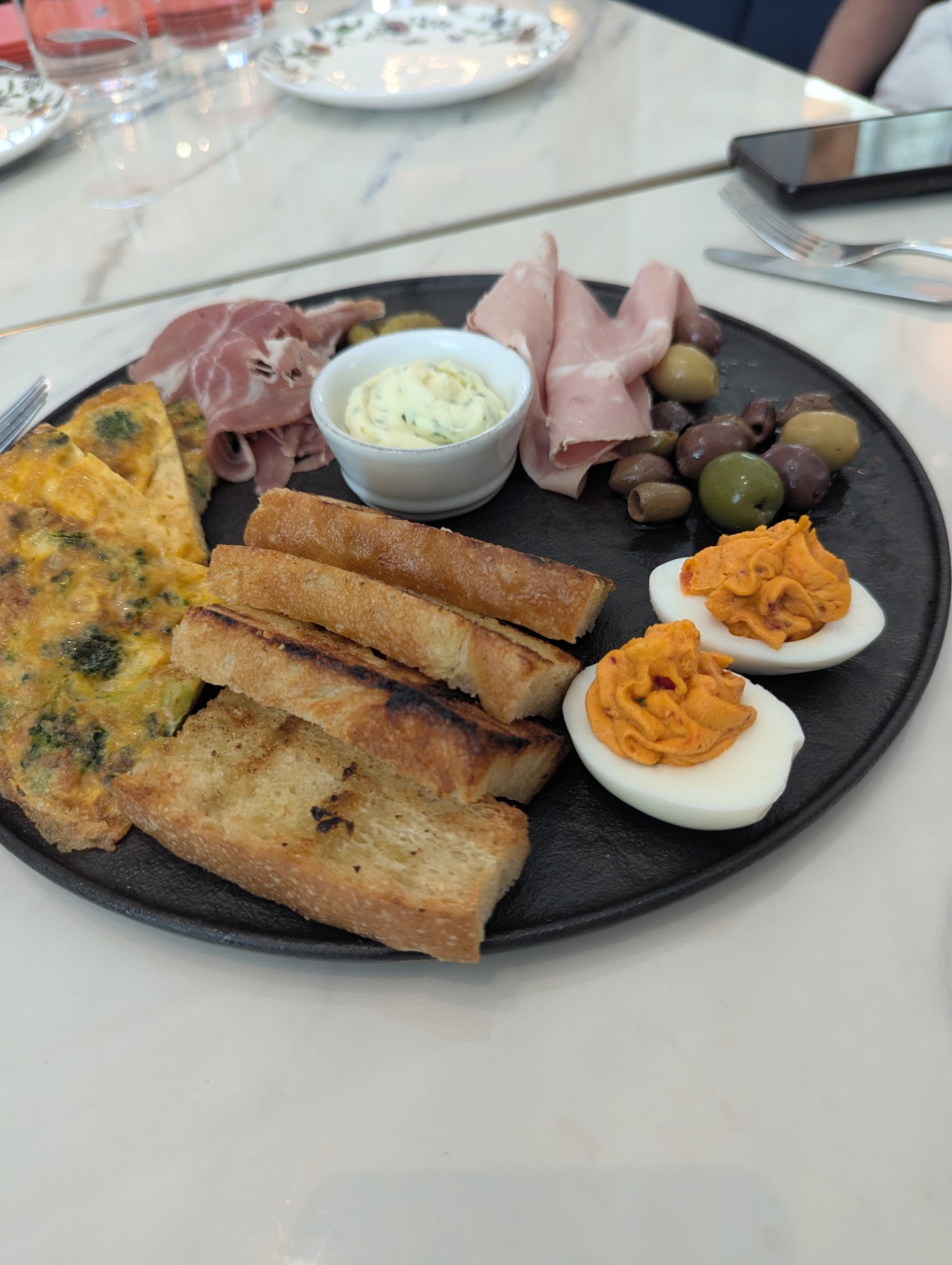 We started with the brunch board, which had a great selection of meats, olives, and focaccia. The deviled eggs were a nice touch. Standard sort of fair, but executed very well.
