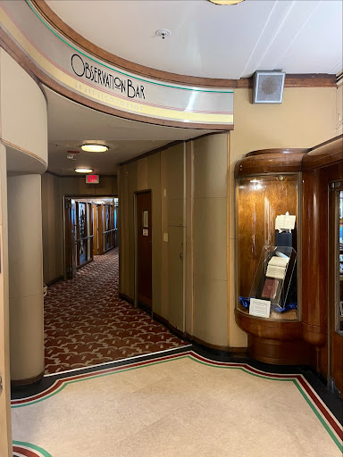 Category: Cocktail Lounge. After a wonderful tour of the Queen Mary, both guided and self-guided, we retired to this classy Art Deco bar to pretend like we were among the 800+ First Class passengers who made it their tippling home while crossing the Atlantic during the ship’s glory days. Located near the prow, the bar’s wall of windows provides an expansive view of Long Beach Harbor. The festive 1935 Alfred R. Thompson mural above the hardwood-paneled and aluminum-banded semicircular bar, “The Royal Jubilee Week,” depicts well-dressed dancers with joined hands — one of whom is King George V (where’s Waldo?) — circling a statue of a man on horseback. The understatedly opulent room is anchored and accented by large bright red urns and columns, and a red railing capping the cast-aluminum barrel-themed balustrade separating the upper and lower levels. We snagged one of the small cocktail tables along the windows, surrounded it with the comfy rolling club chairs for the five of us, and spent the next hour or so enjoying cocktails while Observing both the bar and the harbor’s sights. The menu offers shareable small plates and signature cocktails, but the bar can make anything. Whether you have just toured the ship or are hoteling onboard, or are just in the area, this is a unique place to relax, unwind, and soak up the historic ambience. YouTube’s...