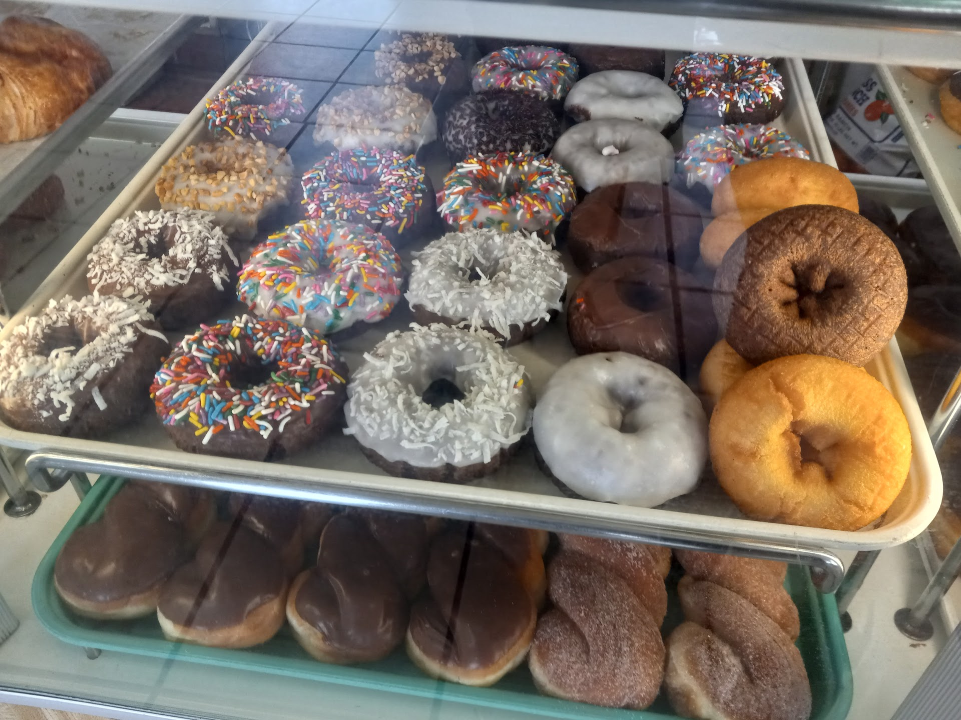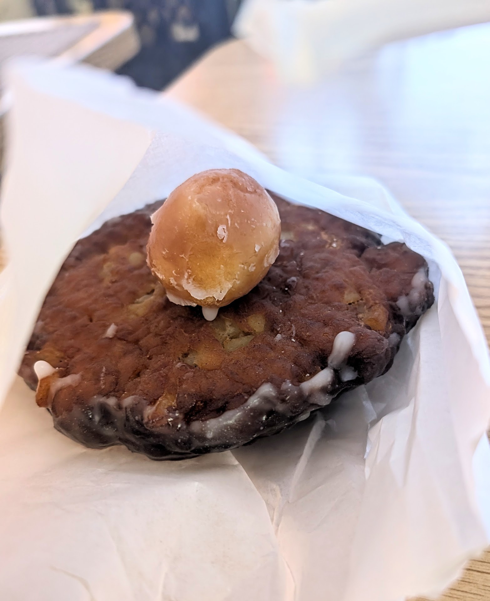 Read moresome top-tier donuts, apple fritter and freebie donut holes were lovely: decent spice, big apple chunks, and a glaze that wasn't teeth-shattering sweet for both of em. the dough was soft with a bit of chew, not airy or a brick—just solid, good donuts. the thai tea though, yikes; overly sweet yet watered down, and full of loose tea leaves that the worker reassured as "normal" [not for me 😭], seems like hella sugary drinks are the norm here from other reviews, so i'll stick to...