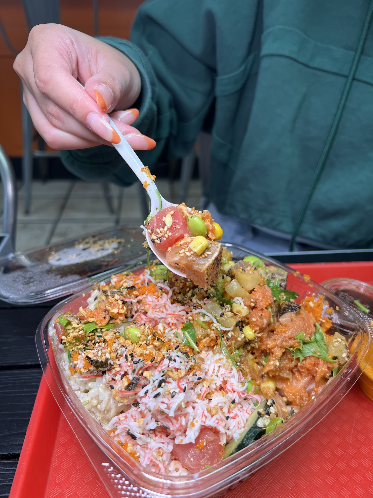 Large Poké bowl - 2 bases, 4 proteins, half brown rice & half spring mix, ahi tuna, salmon, spicy tuna, seared albacore topped w/ carrots, cilantro, corn, cucumber, edamame, pineapple, sweet onions, spicy house sauce, spicy mayo sauce, seaweed salad, crispy garlic, masago, sesame seeds, furikake. Everything tasted fresh! The bowl was also packed. My favorite proteins are the salmon and ahi!