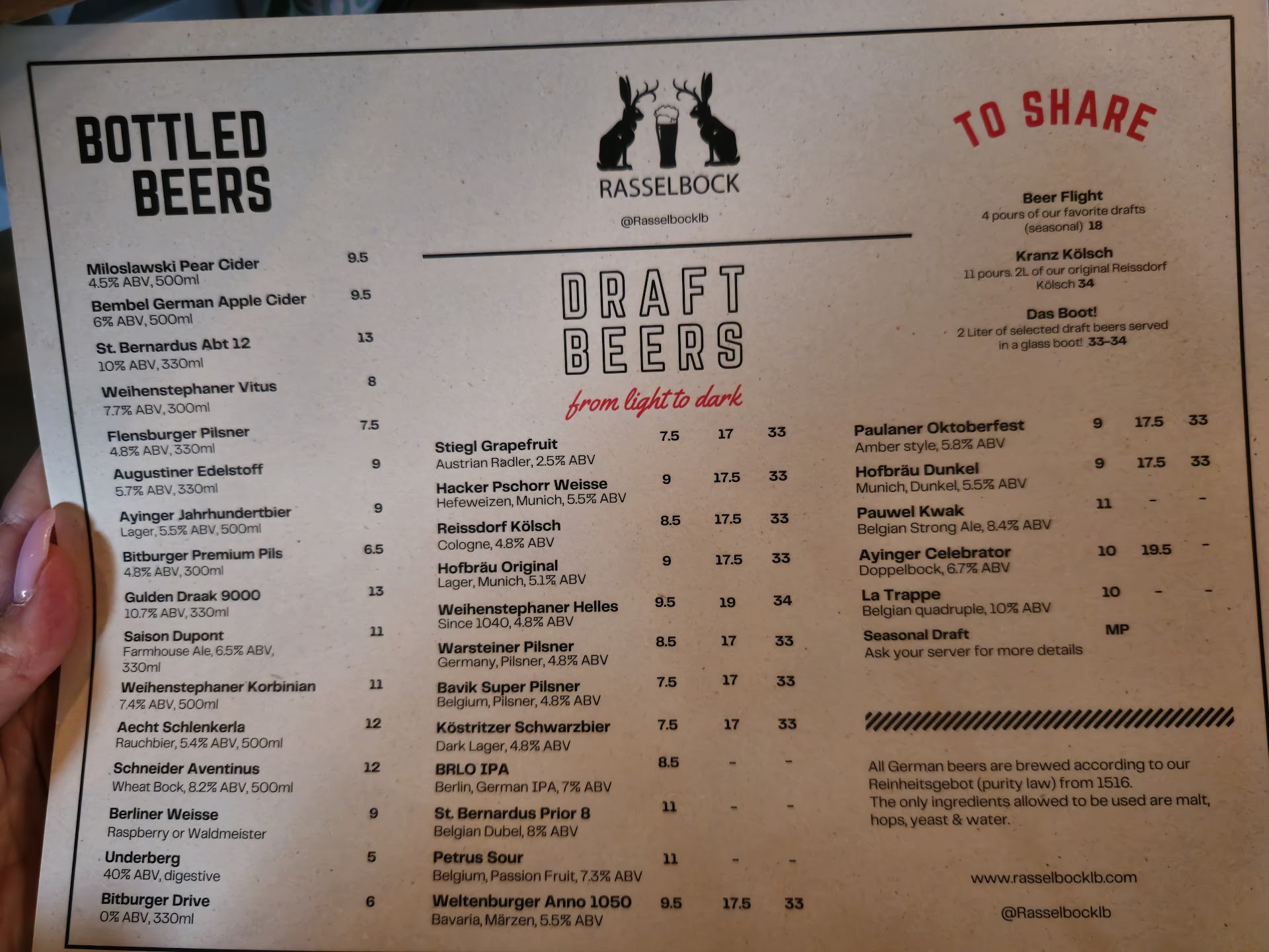 Draft Beers (0.3L / 0.5L / 1L): Around $7.5 / $17.5 / $33 Kƶlsch Kranz (11 small pours): $34 Das Boot (2L): $33ā34