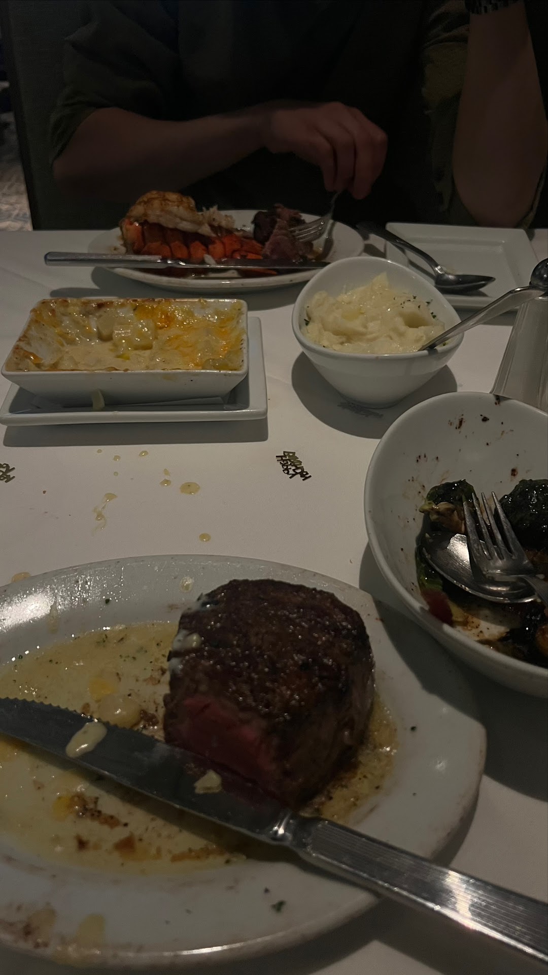 I had the 11oz sirloin, and two sides: brussel sprouts and au gratin. My partner had the lobster and 6oz sirloin 3 course meal with mashed potatoes. First off the bat, every single thing was EXTREMELY oily. Far too much for everything but whatever, maybe we just ordered really greasy food. My au gratin could have been yummy except the potatoes were practically RAW. None were cooked all the way through, some more than others but honestly a lot of the potatoes were crunchy, drowned in the most oily cheese sauce I’ve ever had. The brussel sprouts were alright. Pretty mid, more soggy and oily than crispy like they were supposed to be. My partner’s lobster was over cooked and rubbery, not the worst but when you’re paying that much for food it better not taste like a tire! The mashed potatoes had a huge layer of butter on top but tasted pretty yummy. That was until we discovered part of a BUTTER wrapper in it. We found a piece of plastic, let the waitress know. We wanted to get some of the money back since we were not gonna eat it. She was apologetic and very sweet but said there wasn’t anything that could be done about the charge since it was part of a 3 course meal as a single cost but that she’ll see what she can do.