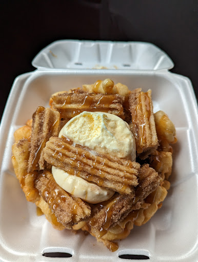 Finally got a chance to try Sticky Icky Funnel Cakes. Service was fast and friendly (which is always a plus). I ordered the churro funnel cake which came with a scoop of vanilla ice cream, churros and caramel. It was good but I feel like it was missing something. I was not a fan of the vanilla ice cream at all but the funnel cake and churros were ok.
