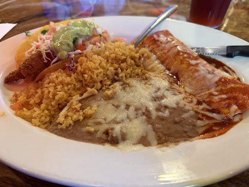 A chicken enchilada drowned — gloriously — in red sauce and melted cheese, the kind of dish that refuses to be delicate because pleasure shouldn’t be. The rice is seasoned with respect, not laziness, and the beans wear their cheese like a warm blanket.