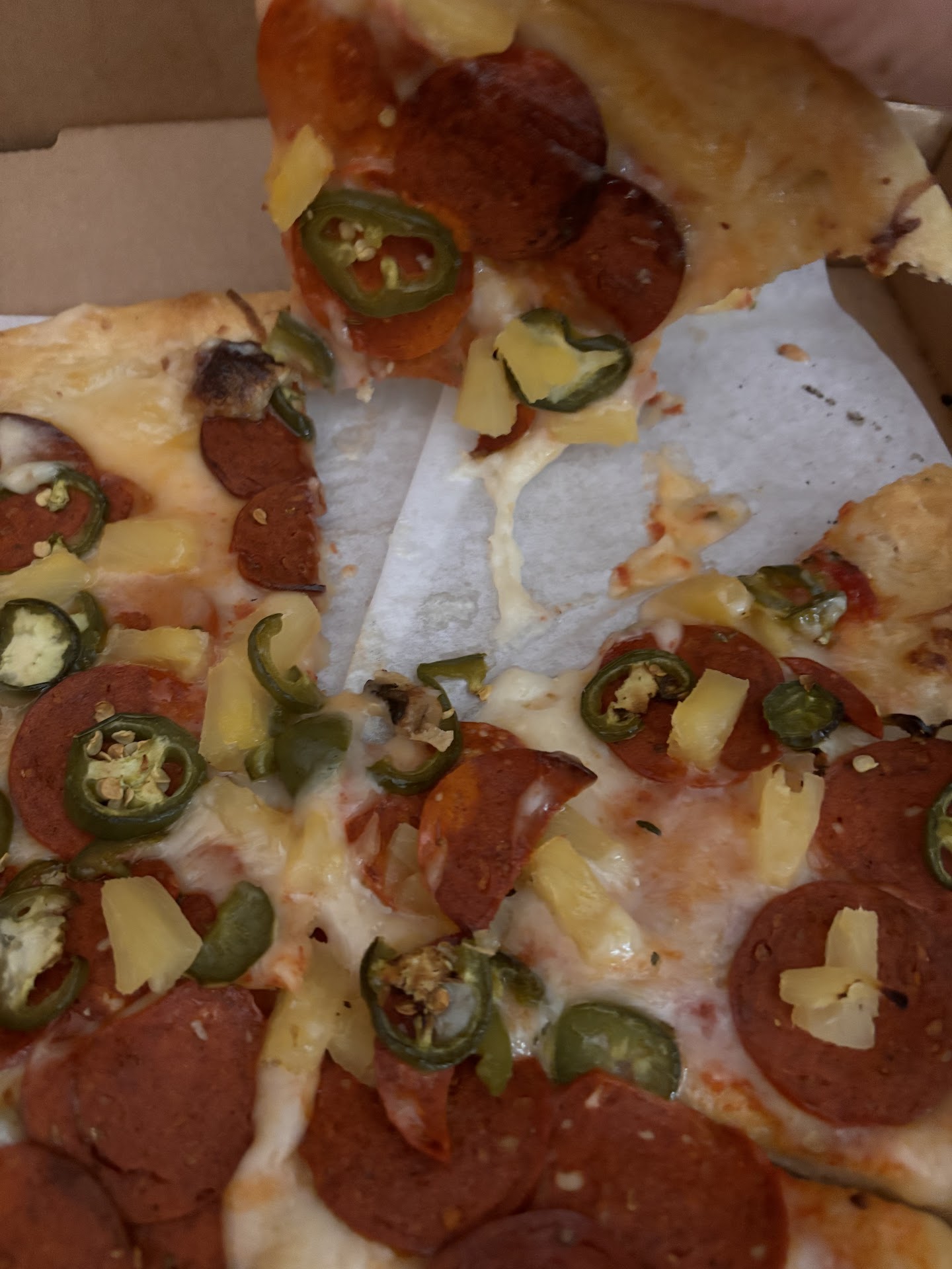I ordered a vegan pepperoni pizza tonight with pineapple and jalapeños and breadsticks. Breadsticks were good. The pizza… was something else.