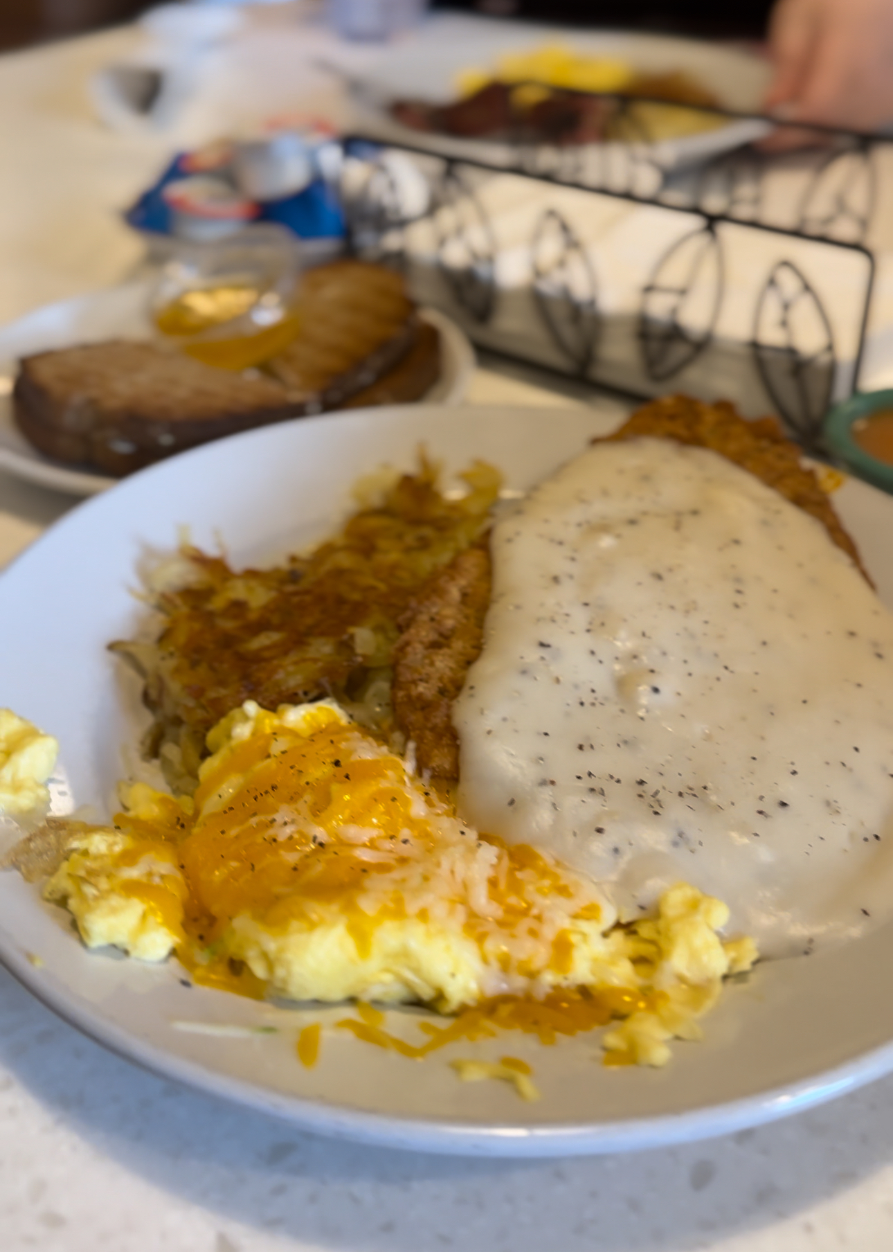We were invited here, it was busy, there was a wait. I was told the food was really good, priced well (affordable) but for me it was just ok, the taste. I got the chorizo burrito, in ingredients themselves were ok, but was like a layered burrito. I mean potato's with chorizo, some egg, then the beans were in last bites. A lot of restaurants do to this, but why? The combination of ingredients is delicious, why are they so separated? In the end, it was like eating a been & cheese burrito. The chorizo is a spicy salty meat, and it did have good flavor, the potatoes could have used some of that salty seasoning. My sister loved her pork chops, my husband ate his so fast I forgot to take a photo. I did taste the pancakes, but for me they weren't special, just regular alitttle chewy, a texture I'm not fond of in pancakes, and a hint was that my fork wasn't cutting the pancake quickly & easily. The butter, I was unsure if it was margarine, I prefer real butter. I forget what my brother in law had, but I did try the toast. He said it was sourdough, but it had no sourdough flavor. It was buttered, maybe that took flavor if it was margarine? I tried my sisters coffee, it was served steaming hot, it looked good. However once I tasted, it was a little bitter, meaning they reheated or kept it too hot that it turned bitter. I was surprised that it was bitter, so many people and they didn't have fresh coffee? I'd give it another try, maybe it was just me because...