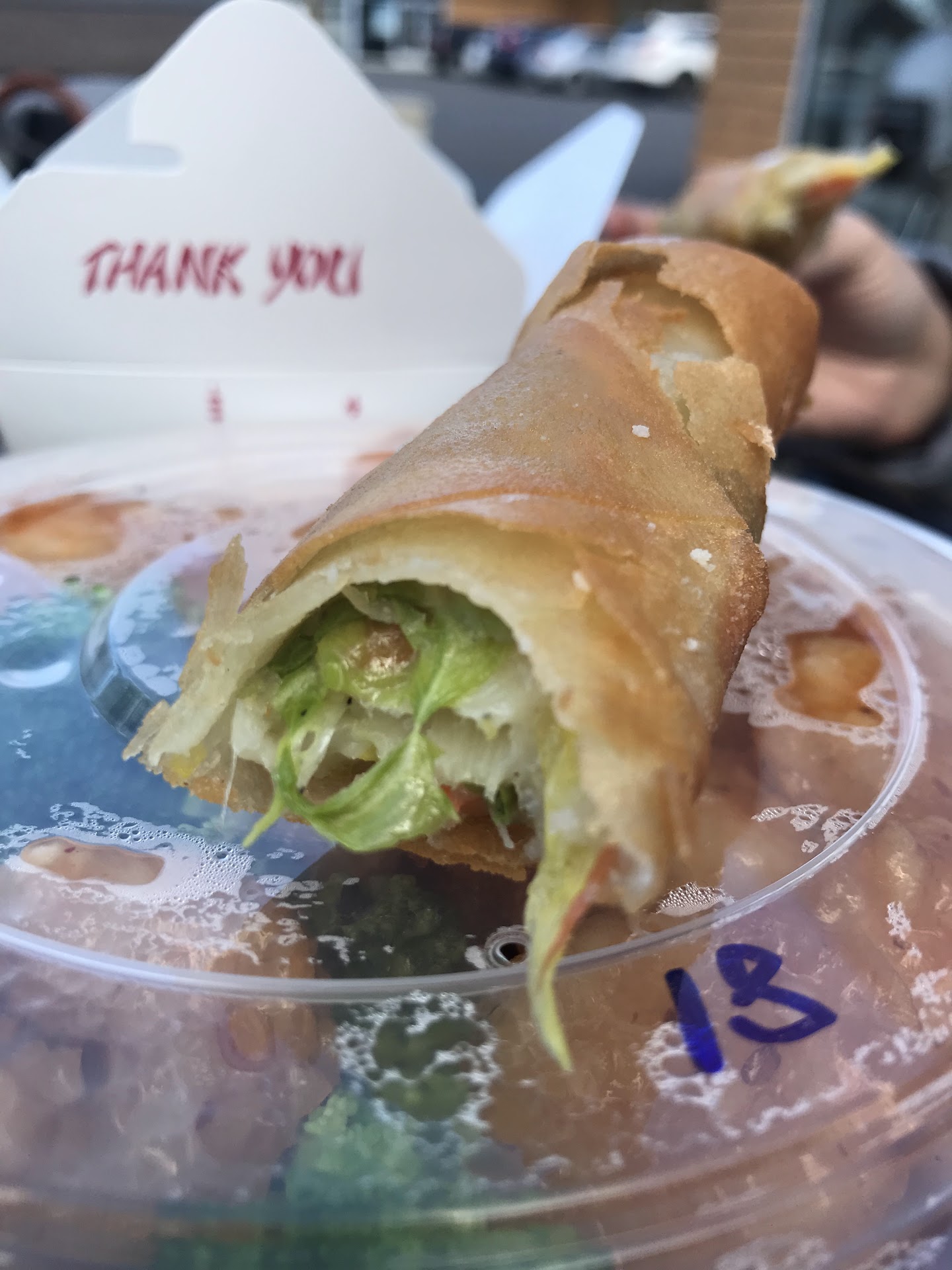 Once the food finally found its way into my hands, I took it back to the car to see what might be salvaged. My fears were affirmed, however when I found lukewarm, soggy chicken (I suppose living up to the Slippery Chicken moniker in a literal sense), but also chewy, dry chicken. My wife could not have been more disappointed. The spring rolls were cool and greasy. My beef was freshly fried, and the coating crispy, but seemingly (and surprisingly) overcooked and quite chewy as well. Like fried jerky, almost.