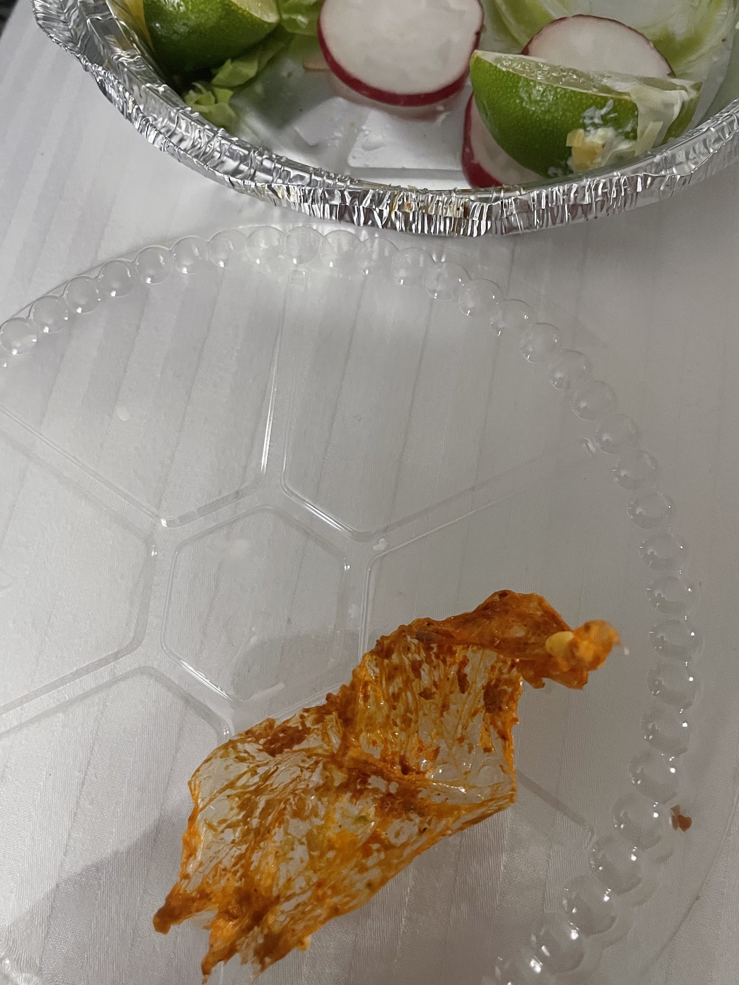 Chips and table salsa: green and red salsas were served at the table in little bottles. No dish was provided to pour salsa into. I assumed that the server forgot to bring a dish, but they actually intend for customers to pour the salsa on to each chip. Never seen that before. They gave us share plates.