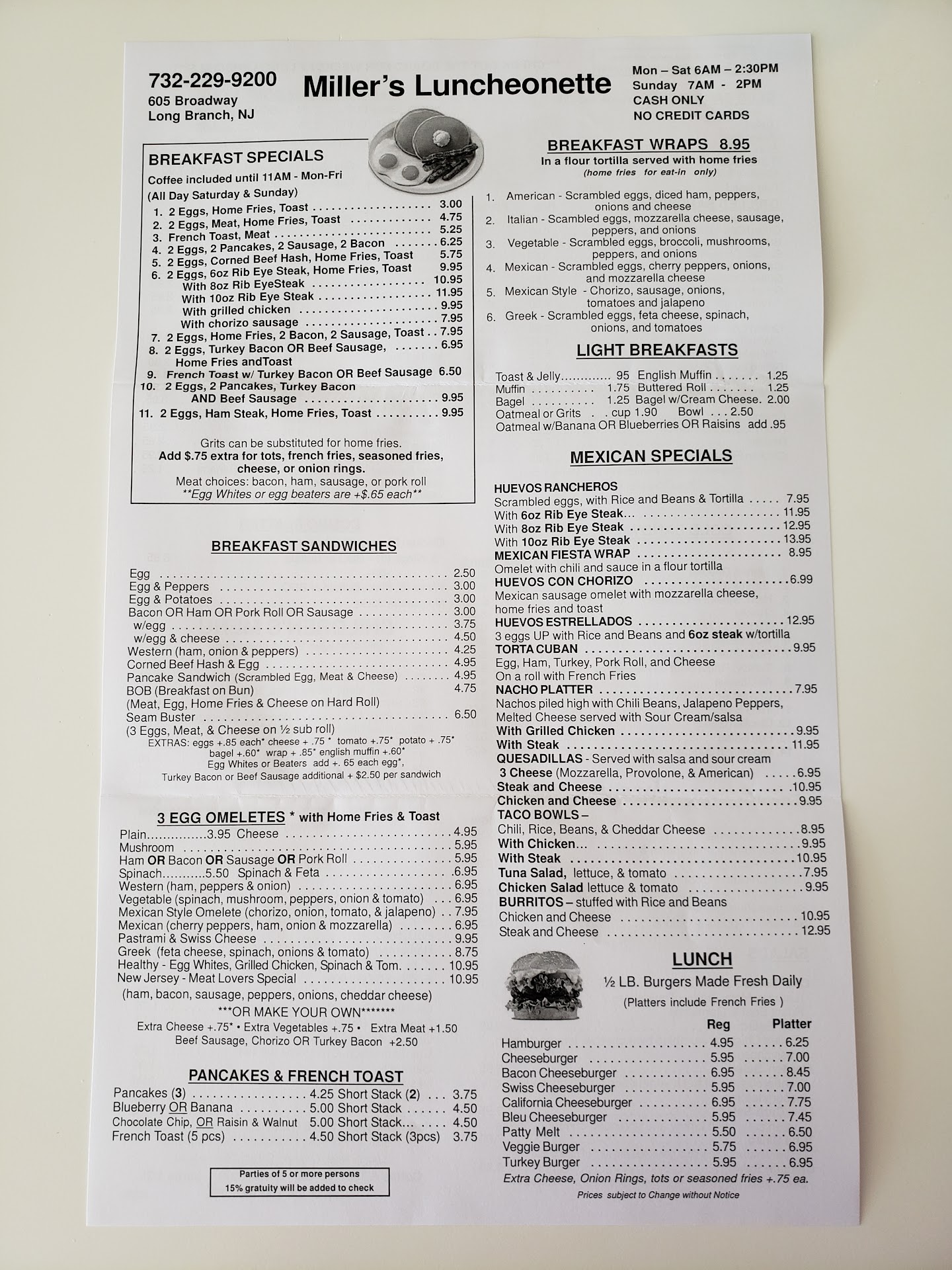 Miller's is an old diner, which is the only reason I am not giving it a five star rating. The people who work at this diner work hard to keep up with the constant flow of people who flock here for truly the "BEST BANG FOR THE BUCK"! The more expensive diners serve the same egg's and potatoes. This owner is not gouging it's customers to pay for their luxury cars. I don't think I can find anywhere else that serves an extensive menu as reasonably priced as Miller's. I think the staff has not changed much from the day I accidentally discovered this tucked away diner. I love this place, especially since I have four kids. I am able to enjoy my meal and relax knowing my kids aren't going to break the bank with whatever they decide to order. This is the only place where I will purchase a Ribeye steak (8 ounces) with my breakfast and get two eggs, toast and home fries for just under $10. You can get three options just on the steak size (6oz, 8oz and a 10oz). The more I think about it the more I admire this place. Thank you Miller diner for keeping cost under control and giving us a great...