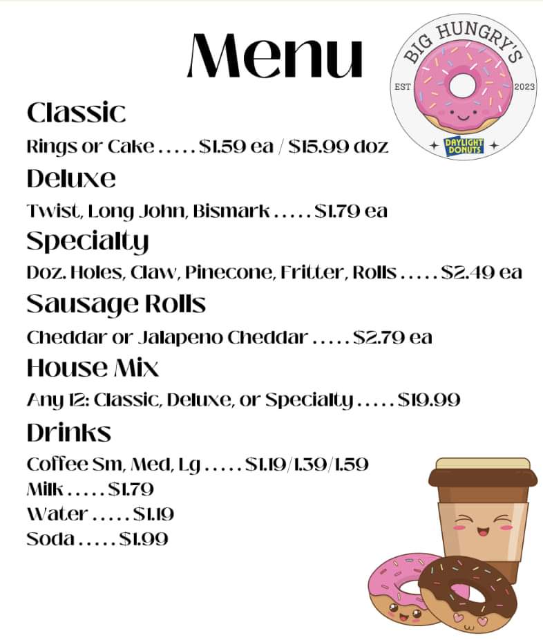 I asked my husband to stop at Big Hungry's Daylight Donuts so I could try their donuts and I'm so glad I did. They offer many different donut styles and flavors as well as sausage rolls. I was extremely impressed they had iced long John's with no filling. Normally I am never able to find this type of donut but they had them available as well as twist, which are my favorite. I also had a spicy sausage roll and it was so good I ate it before I got a picture. Will be back soon for...