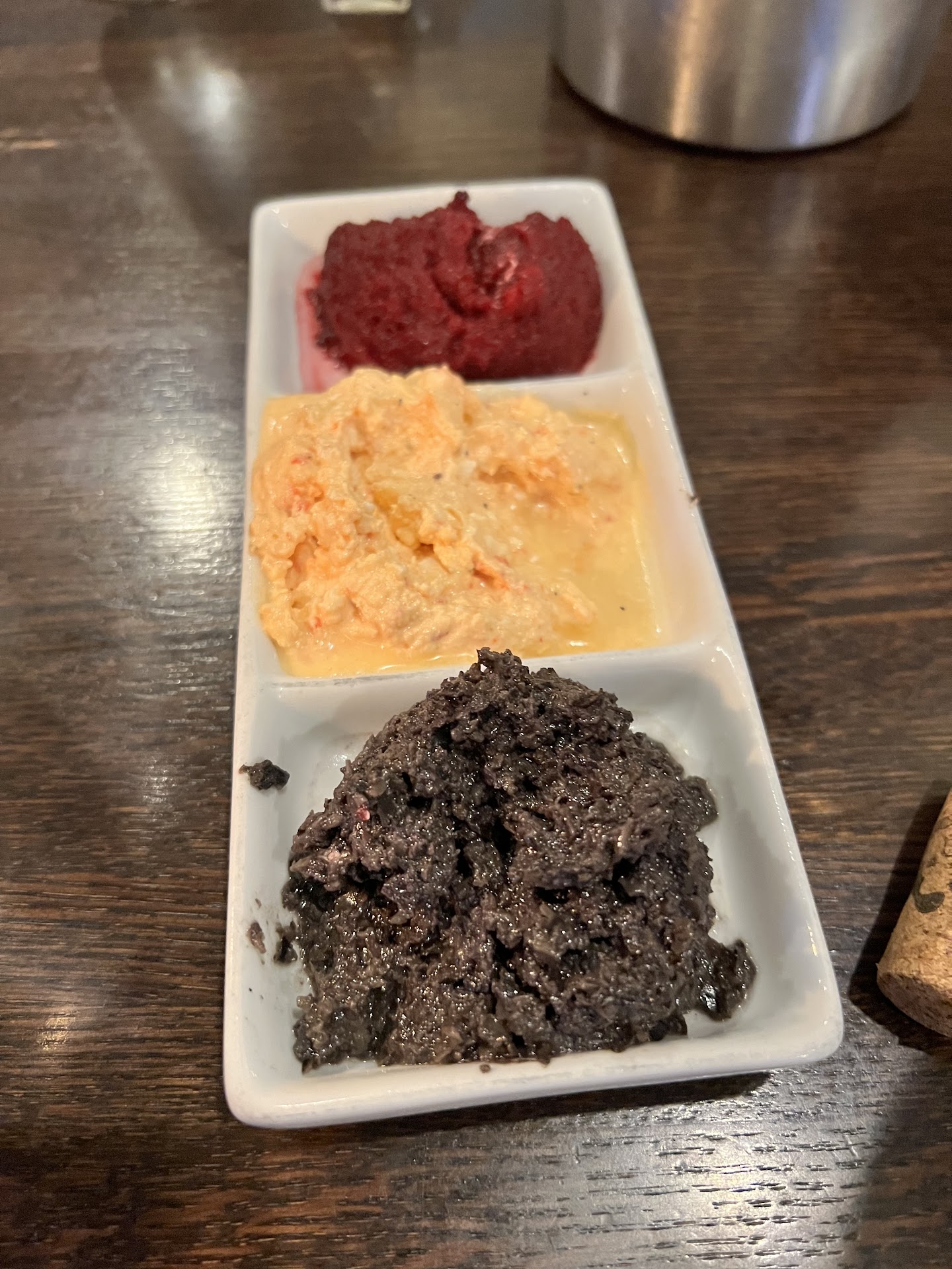 Before any food arrived we enjoyed complimentary pita bread with cheese, olive and beet spreads.