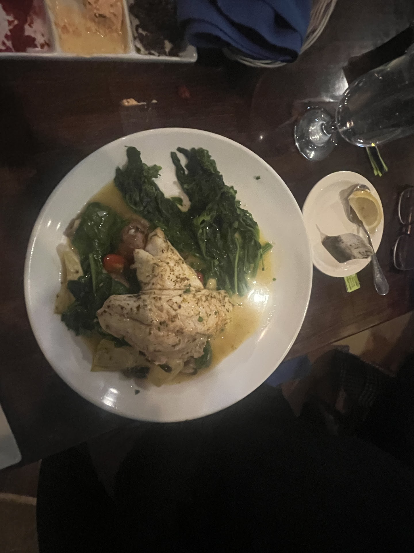 My partner had the red snapper with toasted potatoes, tomatoes, olive, artichoke hearts, in a white wine butter sauce with broccoli rabe. I tasted her dish and it was delicious! The fish was cooked properly and not dry, and the white wine butter sauce was delectable.
