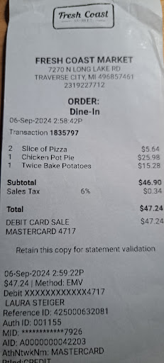 Read moreWe live very close to Fresh Coast and it's been our "to-go" place. I work from home a couple days a week and every day I'm home, I would get a breakfast sandwich or lunch from there. (Excellent sandwiches). There has been a decline though. We got soups to go one day. I pulled the minestrone from the bag and thought I got the wrong order. When I opened the lid, it was clear instead of a beef broth base. Not only was it clear, but it only had celery and onions, so it was hot water with some veggies. Also, since our last trip there, soups are now $10 a bowl! I compared their prices on some things with other stores and everything is double. $6 for a box of crackers. I know prices have gone up everywhere, but FC has gotten out of hand. Everyone also told us to stay away because of the owners attitude and politics. The employee's there are wonderful however, I have seen the owner be rude to his employees and even had an attitude with me one time. We don't care about others political opinions, but I have seen him boast on FB that he's never once worn a mask (even though he has) and tries to push his beliefs on others. Don't mix your politics with your business, it's like saying you don't care about half your customers. He's responses are also very unprofessional. Go to...