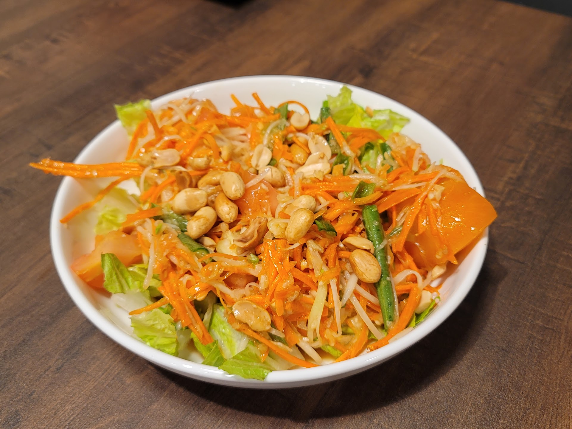 The Som Tum salad, which was refreshing and zesty, with crunchy strips of fresh green papaya and carrot, green beans, and lettuce topped with peanuts. The dressing was spicy, sour, sweet, and salty. I thought the pungent garlic taste was perfect, but it was a bit too garlicky for my spouse.