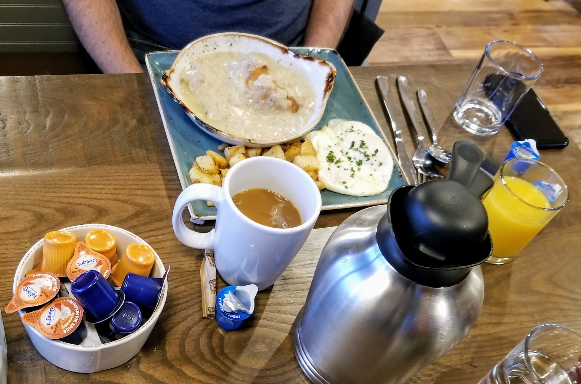 Service was great and our server had a nice chat with us about their past experience at Egg & I and other restaurants. The music started out at a good volume but became much louder while we were there. Apparently the volume setting is a corporate standard, but that's ridiculous - they should vary it based on their customers' feedback. Maybe that'll adjust over time.