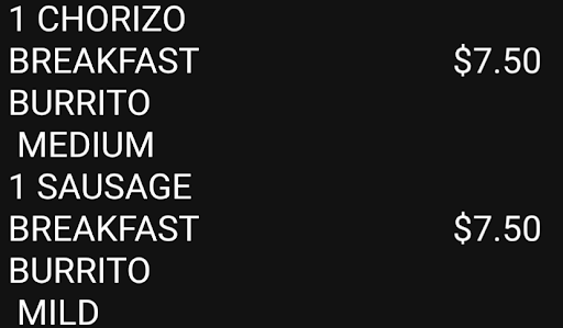 Read moreBreakfast burrito to-go was very tasty. A reasonable size, and reasonable pricing. I was bummed that there was no hot sauce included in the bag, and when I asked for some, I was informed they were $0.50 each for a ramekin. As I had no cash and didn't want to bother using a card, I declined. The nice folks behind the counter ended up gifting me one for the four burritos I bought, which I appreciated. The hot sauce was very tasty, and delightfully spicy.