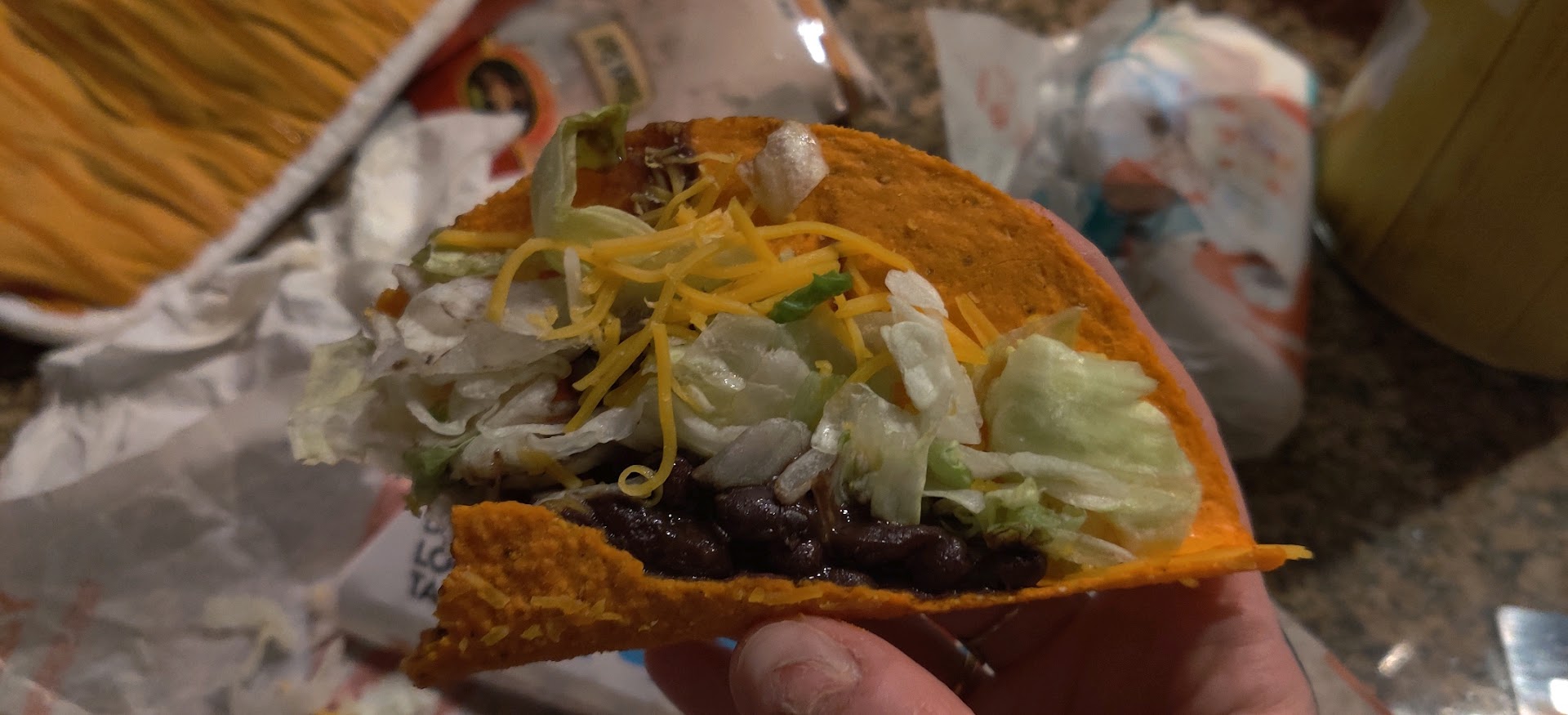 Read moreI'm not one to complain about food places often but something has to be said. But where to start? So placed a mobile app order thinking it'd make things move along a little quicker. Our second mistake. Show up to multiple cars waiting a while to order at speaker as expected on a Friday night. Cool. We finally get there after 10 minutes and spend our own 10 minutes waiting to hear something from the staff. Finally get to pull forward, wait a few minutes for other orders to be passed out and eventually get to the window. Phew. In the home stretch...wrong. Waited 20 or so minutes at the window waiting on 7 rather simple items! Craziness. Get home, anxious to eat, and man was it a mess. Sour cream was left out of everything that was supposed to have it. Ingredients were added to things where they weren't asked for. And substitutions were made in place of others that weren't mentioned. Not to forget though, the rice in a couple burritos was too hard to chew. Shell in the crunchwrap was like wet cardboard. I get short staffed and busy but there should be some sort of standard kept, no? Will make the longer drive from now on to avoid this dumpster fire. I suggest you do as well. (Choosing this Taco Bell was our first mistake if it hadn't been implied) all else following that was...