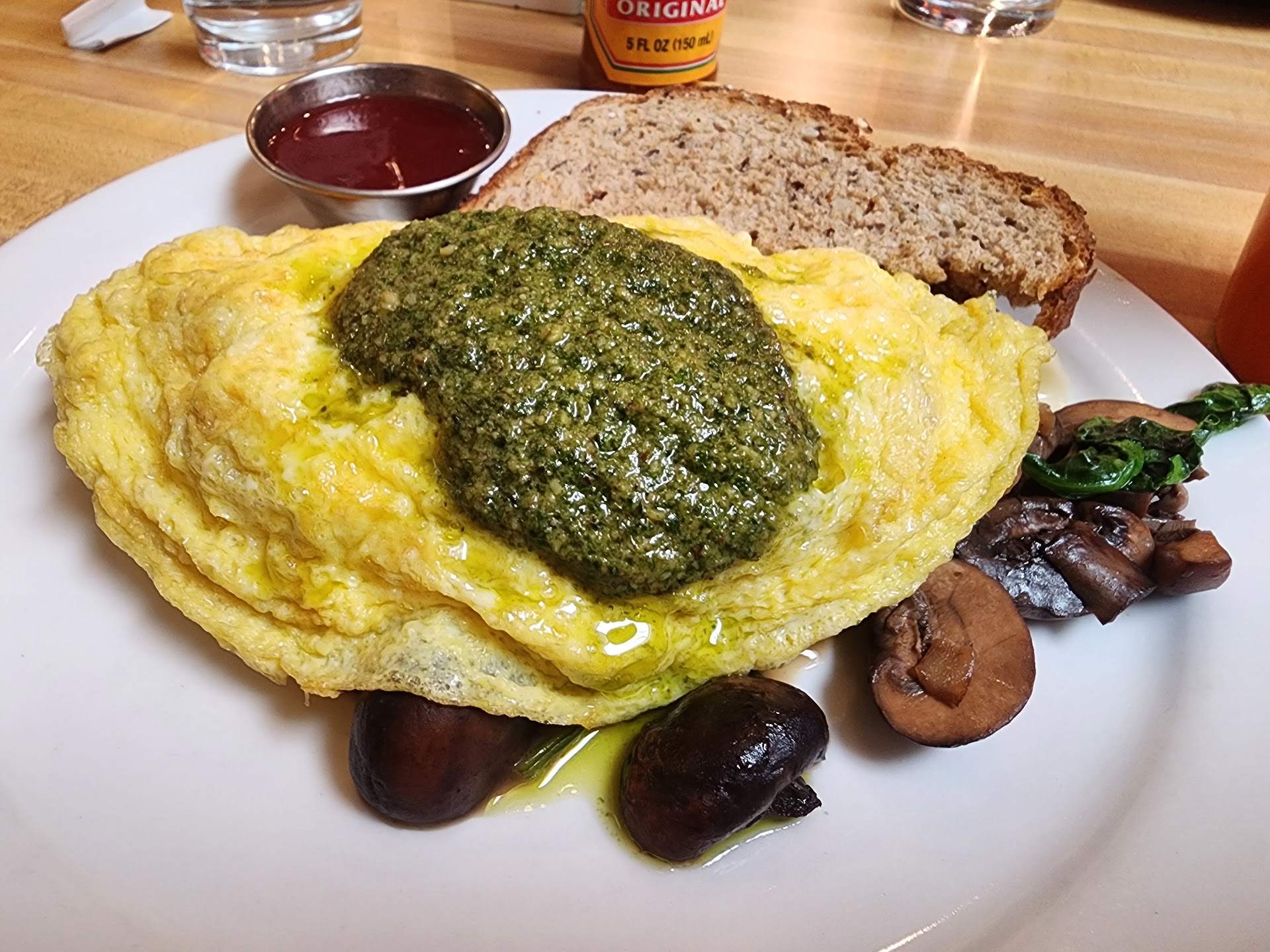 The puttanesca scramble seemed to be slopped on to the plate with little care. From my side of the table it had an off color. My friend said the flavor was okay but the temperature was not hot. She stopped eating it after finding the middle of the onion (about a 1/2 inch big) in the middle. Her english muffin also seemed to be untoasted and served with a jam that poured like a sauce.