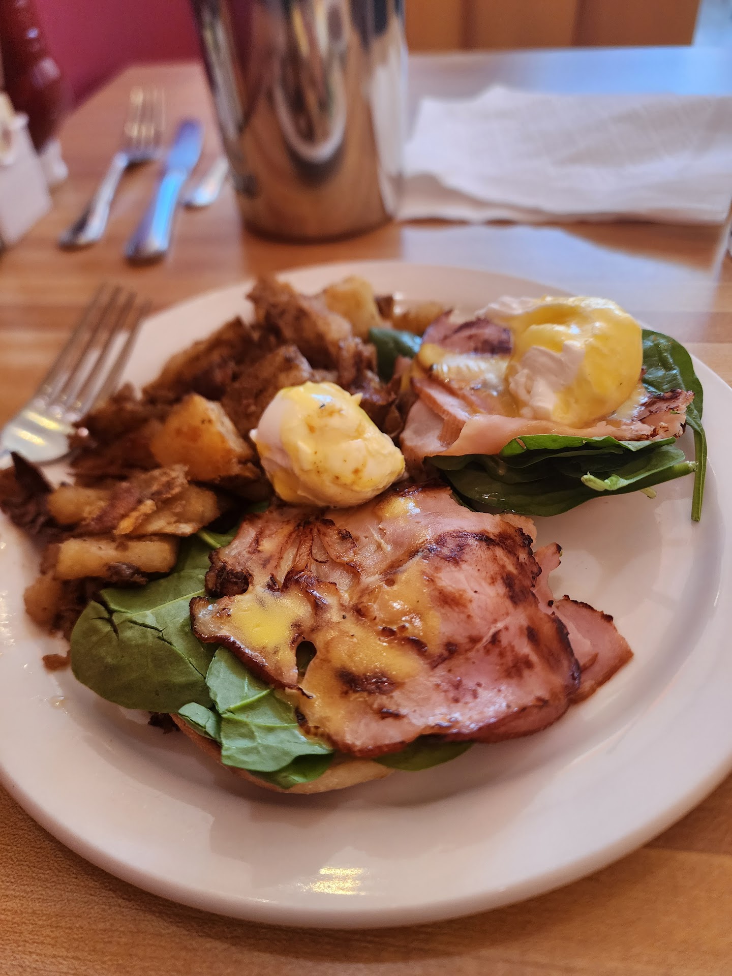 The veggie benedict was cold with just a hint of hollandaise and very untoasted english muffin. The very small serving of breakfast potatoes that was unevenly cooked; some were raw and others were so over cooked it was on the side of burned due to the uneven sizes.