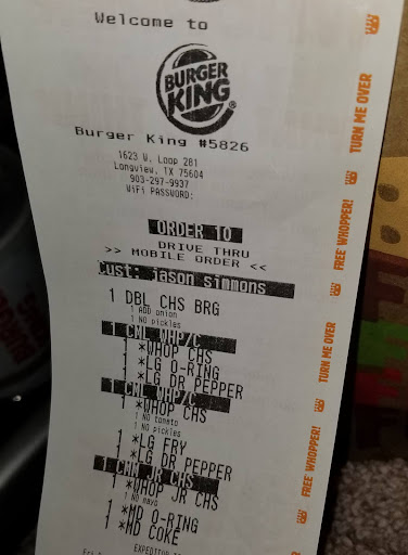 Read moreThis specific burger King, #5826, has the closest tasting chi'king to the Tyler location. The Tyler location makes such a good chi'king that I ate it immediately after my numbing wore off from a root canal. It was 100% worth it. In fact I loved the chi'king from Tyler TX so much that I had a friend make me vinyl decals of the chi'king logo on my tumblers. Since my first time trying the chi'king in Tyler, I have eaten at every fast food chicken place in Longview and nothing else compares except this locations chi'king. Also on my visit I just had to this location, I was asked to pull around to the front of the store(which I gladly wait for the sandwich everytime they tell me it will take a minute) and I waited on my sandwich to be handed to me. The most amazing thing about the visit is when she came out to give me the sandwich she offered to refill my sweet tea for me. The lady with white hair and the tattoos is the best employee at this location in terms of customer service. I tried to fill out the survey on the receipt but it did not print the survey code so I came here. I am very pleased with this location and will...