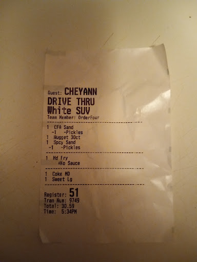 We normally LOVE this location, as with all of the CFA locations we visit. The last time we visited something was going on with the clerks in the drive through. We were following the vehicles in front of us like we always do, the car in front of me & behind me both went to the right and I stayed to the left. As we were driving up, I kept noticing the clerk to our right was going from vehicle to vehicle, but the clerk on our side had gone inside as we pulled up to the beginning of the drive through. We tried to get the clerk's attention, but she just kept going on the right. We kept the line moving by pulling up, and another clerk from the right came up to the vehicle behind us and started taking her order & proceeded to the 3 cars behind her. Once she came up beside our window, I rolled it down to tell her our order, but she just walked inside the store. We FINALLY got the clerk's attention beside us in the right and she was confused, but came over to take our order. 4 cars pulled ahead of us at this point, so when we got up to the cash stand, the lady told us what our total was, and I told her that was higher than what the clerk said. She called out my name which coincidentally was correct, it was just the wrong vehicle. So she scrolled down 7 vehicles to find my name and gave me my total. We made it 2 cars behind the window and they brought us our meal. They also brought the vehicle behind us their meal and as she was trying to leave the line, she nearly took out 3 cars including mine because there wasn't enough room for her suburban to go over into the other lane to pull around everyone. We started moving forward and she finally got her vehicle back in line to leave. All of the confusion would've been avoided had the one clerk just not left her post, or communicated with other clerks...